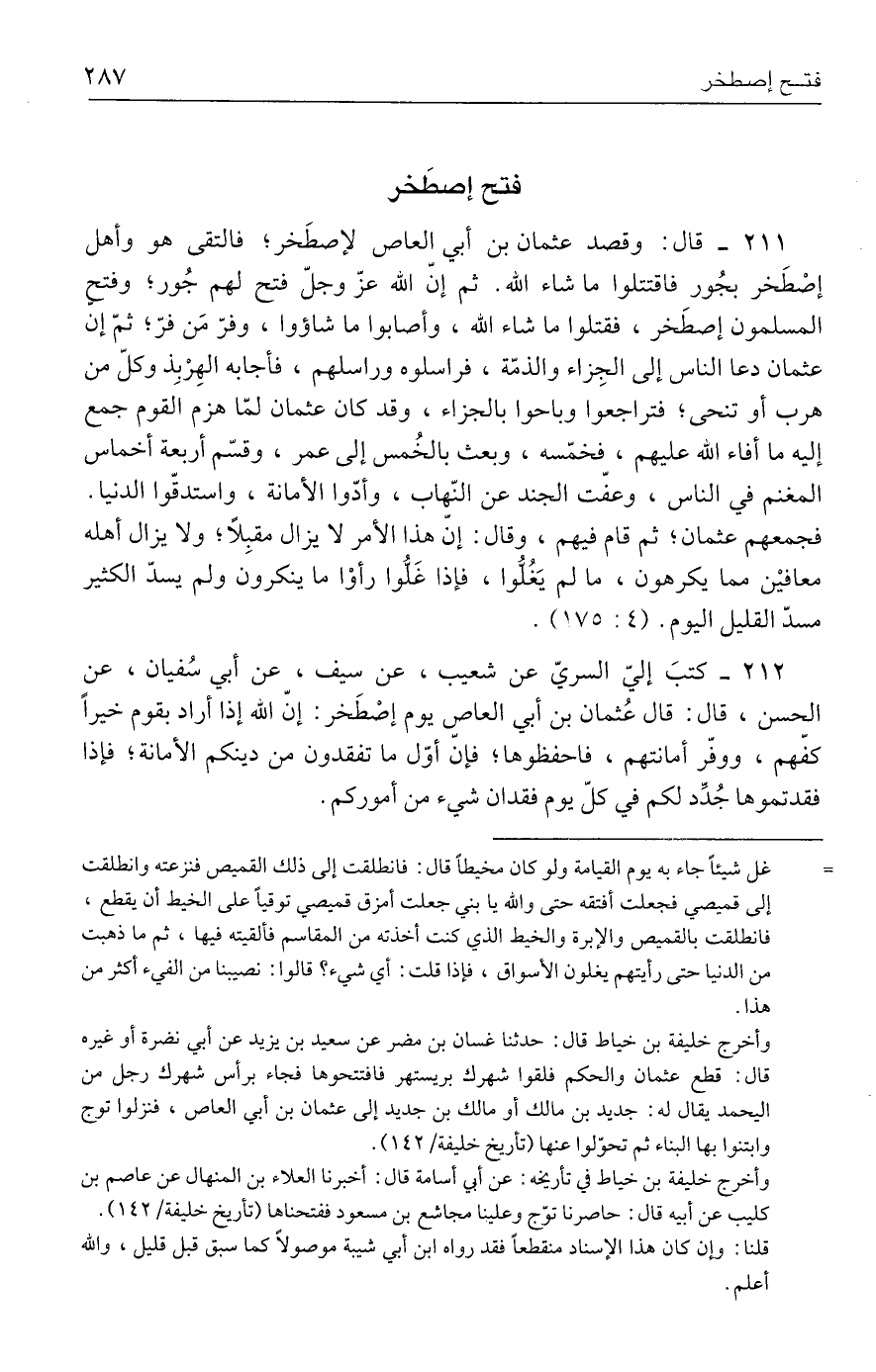 ٢١١ - قال: وقصد عثمان بن أبي العاص لإصطَخر؛ فالتقى هو وأهل إصْطَخر بجُور فاقتتلوا ما شاء الله. ثم إنّ الله عزّ وجلّ فتح لهم جُور؛ وفتج المسلمون إصطَخر، فقتلوا ما شاء الله، وأصابوا ما شاؤوا، وفرّ مَن فرّ؛ ثمّ إن عثمان دعا الناس إلى الجِزاء والذمّة، فراسلوه وراسلهم، فأجابه الهِرْبِذ وكلّ من هرب أو تنحى؛ فتراجعوا وباحوا بالجزاء، وقد كان عثمان لمّا هزم القوم جمع إليه ما أفاء الله عليهم، فخمّسه، وبعث بالخُمس إلى عمر، وقسّم أربعة أخماس المغنم في الناس، وعفّت الجند عن النّهاب، وأدّوا الأمانة، واستدقّوا الدنيا. فجمعهم عثمان؛ ثم قام فيهم، وقال: إنّ هذا الأمر لا يزال مقبِلًا؛ ولا يزال أهله معافين مما يكرهون، ما لم يَغُلُّوا، فإذا غَلُّوا رأوْا ما ينكرون ولم يسدّ الكثير مسدّ القليل اليوم. (٤: ١٧٥).