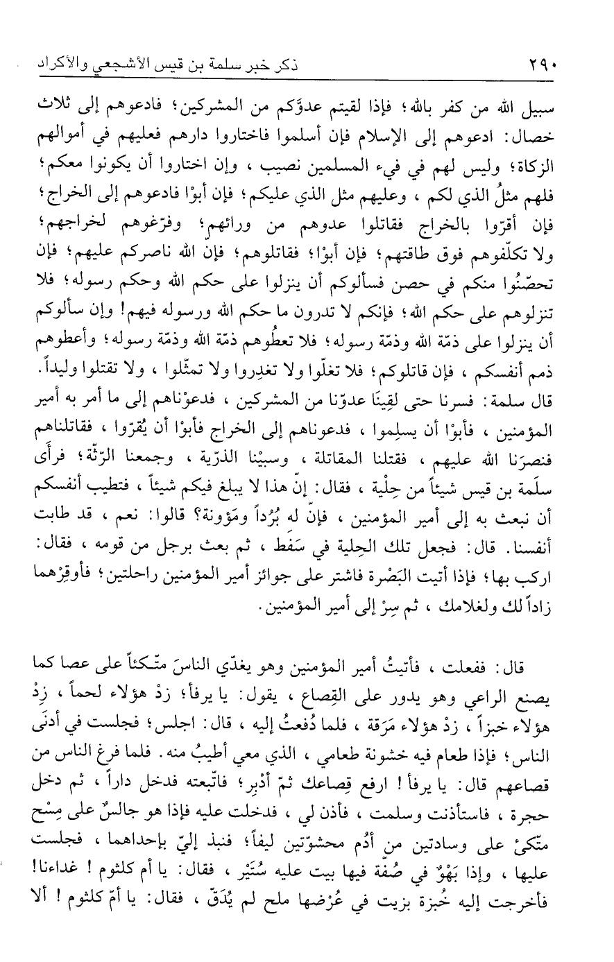 سبيل الله من كفر بالله؛ فإذا لقيتم عدوَّكم من المشركين؛ فادعوهم إلى ثلاث خصال: ادعوهم إلى الإسلام فإن أسلموا فاختاروا دارهم فعليهم في أموالهم الزكاة؛ وليس لهم في فيء المسلمين نصيب، وإن اختاروا أن يكونوا معكم؛ فلهم مثلُ الذي لكم، وعليهم مثل الذي عليكم؛ فإن أبوْا فادعوهم إلى الخراج؛ فإن أقرّوا بالخراج فقاتلوا عدوهم من ورائهم؛ وفرّغوهم لخراجهم؛ ولا تكلّفوهم فوق طاقتهم؛ فإن أبوْا؛ فقاتلوهم؛ فإن الله ناصركم عليهم؛ فإن تحصّنُوا منكم في حصن فسألوكم أن ينزلوا على حكم الله وحكم رسوله؛ فلا تنزلوهم على حكم الله؛ فإنكم لا تدرون ما حكم الله ورسوله فيهم! وإن سألوكم أن ينزلوا على ذمّة الله وذمّة رسوله؛ فلا تعطُوهم ذمّة الله وذمّة رسوله؛ وأعطوهم ذمم أنفسكم، فإن قاتلوكم؛ فلا تغلّوا ولا تغدِروا ولا تمثّلوا، ولا تقتلوا وليدًا. قال سلمة: فسرنا حتى لقِينَا عدوّنا من المشركين، فدعوْناهم إلى ما أمر به أمير المؤمنين، فأبوْا أن يسلِموا، فدعوناهم إلى الخراج فأبوْا أن يُقرّوا، فقاتلناهم فنصرَنا الله عليهم، فقتلنا المقاتلة، وسبينا الذرّية، وجمعنا الرّثّة؛ فرأَى سلَمة بن قيس شيئًا من حِلْية، فقال: إنّ هذا لا يبلغ فيكم شيئًا، فتطيب أنفسكم أن نبعث به إلى أمير المؤمنين، فإنّ له بُرُدًا ومَؤونة؟ قالوا: نعم، قد طابت أنفسنا. قال: فجعل تلك الحِلية في سَفَط، ثم بعث برجل من قومه، فقال: اركب بها؛ فإذا أتيت البَصْرة فاشتر على جوائز أمير المؤمنين راحلتين؛ فأوقِرْهما زادًا لك ولغلامك، ثم سِرْ إلى أمير المؤمنين.