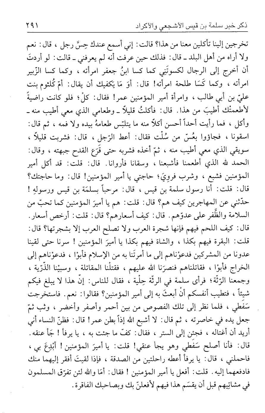 تخرجين إلينا تأكلين معنا من هذا؟ قالت: إني أسمع عندك حِسَّ رجل، قال: نعم ولا أراه من أهل البلد -قال: فذلك حين عرفت أنه لم يعرفني- قالت: لو أردتَ أن أخرج إلى الرجال لكسوتَنِي كما كسا ابنُ جعفر امرأته، وكما كسا الزُّبَيْر امرأته، وكما كَسَا طلحة امرأته! قال: أوَ مَا يَكفيك أن يقال: أمّ كُلثوم بنت عليّ بن أبي طالب، وامرأة أمير المؤمنين عمر! فقال: كلْ؛ فلو كانت راضيةً لأطعمتْك أطيبَ من هذا. قال: فأكلتُ قليلًا -وطعامي الذي معي أطيب منه- وأكل، فما رأيت أحدًا أحسن أكلًا منه ما يتلبّس طعامهُ بيده ولا فمه، ثم قال: اسقونا، فجاؤوا بعُسّ من سُلْت فقال: أعط الرّجل، قال: فشربت قليلًا، سويقي الذي معي أطيب منه، ثمّ أخذه فشربه حتى قَرَع القدح جبهته، وقال: الحمد لله الذي أطعمنا فأشبعنا، وسقانا فأروانا. قال: قلت: قد أكل أمير المؤمنين فشبع، وشرب فرويَ؛ حاجتي يا أمير المؤمنين! قال: وما حاجتك؟ قال: قلت: أنا رسول سلمة بن قيس، قال: مرحبًا بسلمَة بن قيس ورسولهِ! حدّثني عن المهاجرين كيف هم؟ قال: قلت: هم يا أميرَ المؤمنين كما تحبّ من السلامة والظَّفر على عدوّهم. قال: كيف أسعارهم؟ قال: قلت: أرخص أسعار. قال: كيف اللحم فيهم فإنها شجرة العرب ولا تصلح العرب إلا بشجرتها؟ قال: قلت: البقرة فيهم بكذا، والشاة فيهم بكذا يا أميرَ المؤمنين! سرنا حتى لقينا عدونا من المشركين فدعوْناهم إلى ما أمرتَنا به من الإسلام فأبوْا، فدعوْناهم إلى الخراج فأبوْا، فقاتلناهم فنصرَنا الله عليهم، فقتلْنا المقاتلة، وسبينا الذّرّية، وجمعنا الرّثّة؛ فرأى سلمة في الرثّة حِلْية، فقال للناس: إنّ هذا لا يبلغ فيكم شيئًا، فتطيب أنفسكم أنْ أبعثَ به إلى أمير المؤمنين؟ فقالوا: نعم. فاستخرجت سَفَطي، فلما نظر إلى تلك الفصوص من بين أحمر وأصفر وأخضر، وثب ثمّ جعل يده في خاصرته، ثم قال: لا أشبع الله إذًا بطن عمر! قال: فظنّ النساء أني أريد أن أغتاله، فجئن إلى الستر، فقال: كفّ ما جئت به، يا يرفأ! جَأ عنقه. قال: فأنا أصلح سَفَطي وهو يجأ عنقي! قلت: يا أميرَ المؤمنين! أبْدِعَ بي، فاحملني، قال: يا يرفأ أعطه راحلتين من الصدقة، فإذا لقيتَ أفقر إليهما منك فادفعهما إليه. قلت: أفعل يا أمير المؤمنين! فقال: أمَّا والله لئن تفرّق المسلمون في مشاتِيهم قبل أن يقسَم هذا فيهم لأفعلنّ بك وبصاحبك الفاقرة.