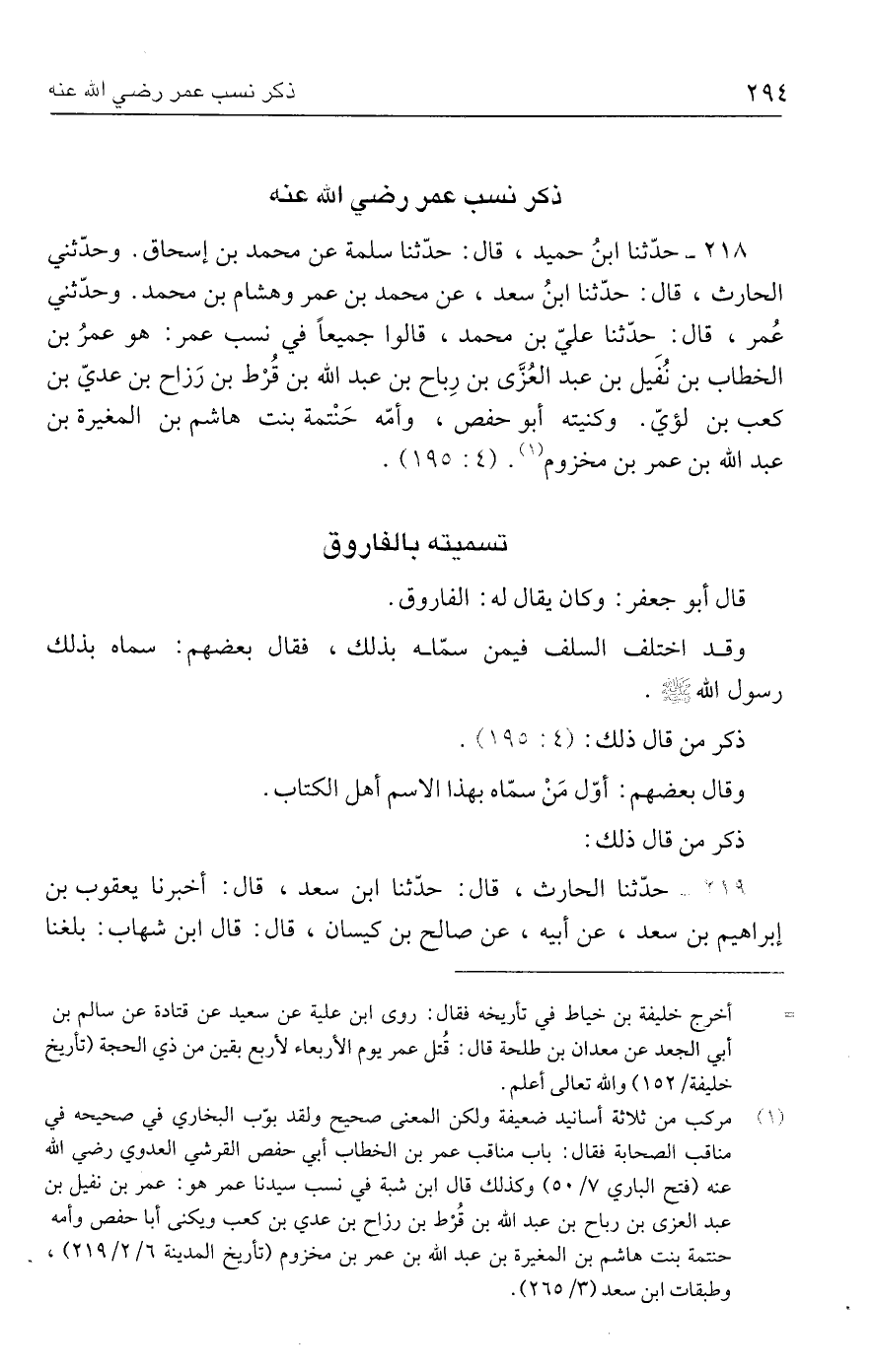 ٢١٨ - حدَّثنا ابنُ حميد، قال: حدَّثنا سلمة عن محمد بن إسحاق. وحدّثني الحارث، قال: حدَّثنا ابنُ سعد، عن محمد بن عمر وهشام بن محمد. وحدّثني عُمر، قال: حدَّثنا عليّ بن محمد، قالوا جميعًا في نسب عمر: هو عمرُ بن الخطاب بن نُفَيل بن عبد العُزَّى بن رِباح بن عبد الله بن قُرْط بن رَزاح بن عديّ بن كعب بن لؤيّ. وكنيته أبو حفص، وأمّه حَنْتمة بنت هاشم بن المغيرة بن عبد الله بن عمر بن مخزوم (١). (٤: ١٩٥).