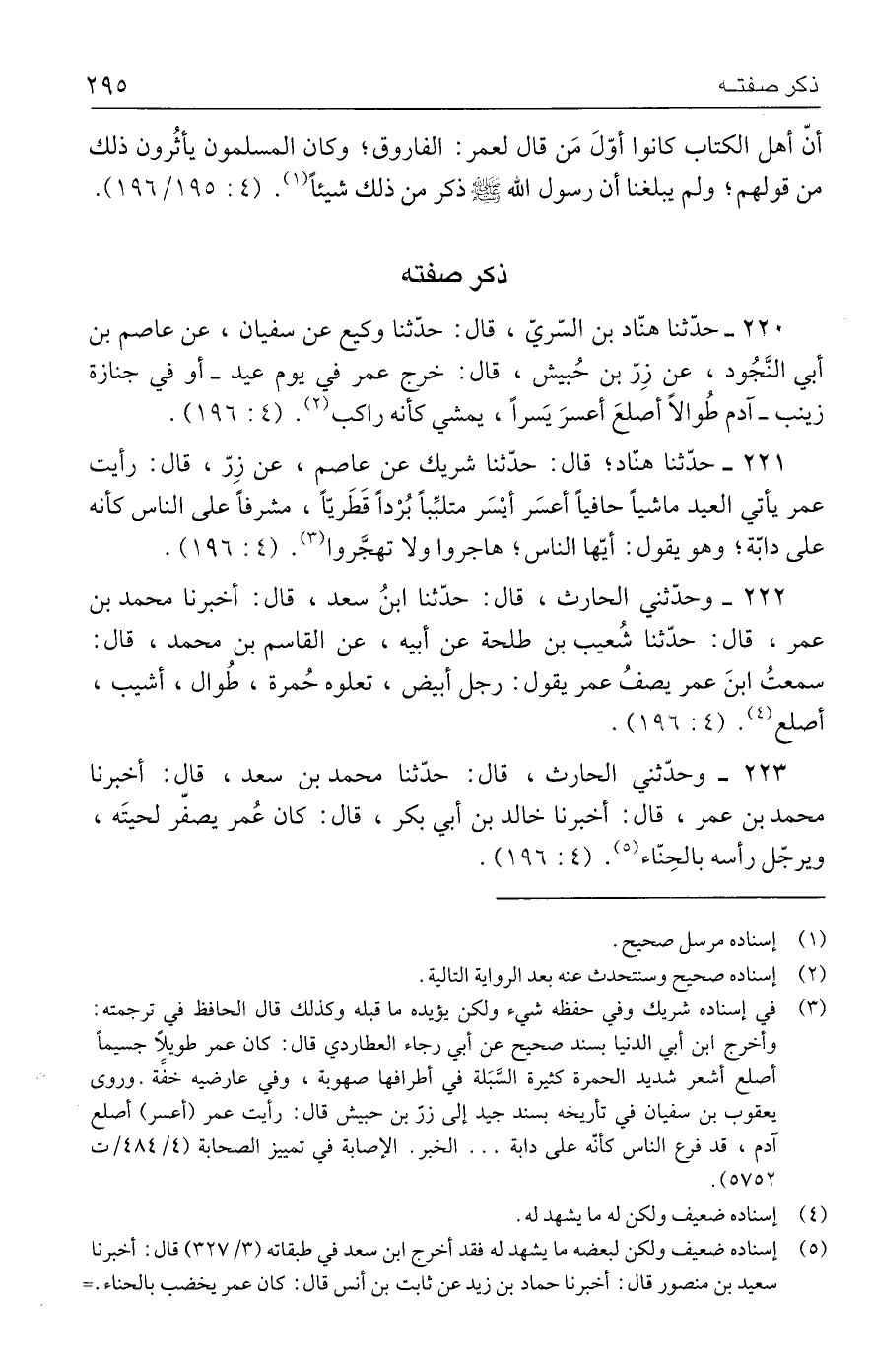 ٢٢٠ - حدَّثنا هنّاد بن السّريّ، قال: حدَّثنا وكيع عن سفيان، عن عاصم بن أبي النَّجُود، عن زِرّ بن حُبيش، قال: خرج عمر في يوم عيد -أو في جنازة زينب- آدم طُوالًا أصلعَ أعسرَ يَسرًا، يمشي كأنه راكب (٢). (٤: ١٩٦).