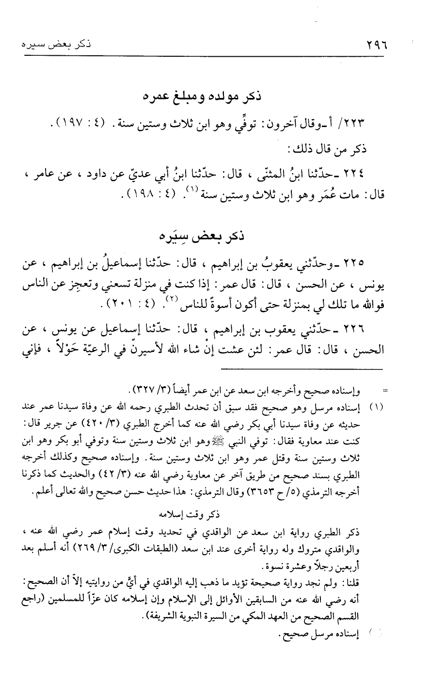 ٢٢٤ - حدَّثنا ابنُ المثنّى، قال: حدَّثنا ابنُ أبي عديّ عن داود، عن عامر، قال: مات عُمَر وهو ابن ثلاث وستين سنة (١). (٤: ١٩٨).