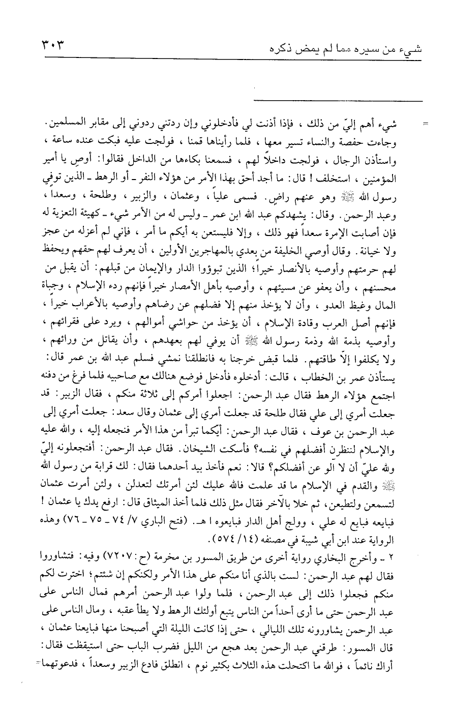 ٢ - وأخرج البخاري رواية أخرى من طريق المسور بن مخرمة (ح: ٧٢٠٧) وفيه: فتشاوروا فقال لهم عبد الرحمن: لست بالذي أنا منكم على هذا الأمر ولكنكم إن شئتم؛ اخترت لكم منكم فجعلوا ذلك إلى عبد الرحمن، فلما ولوا عبد الرحمن أمرهم فمال الناس على عبد الرحمن حتى ما أرى أحدًا من الناس يتبع أولئك الرهط ولا يطأ عقبه، ومال الناس على عبد الرحمن يشاورونه تلك الليالي، حتى إذا كانت الليلة التي أصبحنا متها فبايعنا عثمان، قال المسور: طرقني عبد الرحمن بعد هجع من الليل فضرب الباب حتى استيقظت فقال: أراك نائمًا، فوالله ما اكتحلت هذه الثلاث بكثير نوم، انطلق فادع الزبير وسعدًا، فدعوتهما =