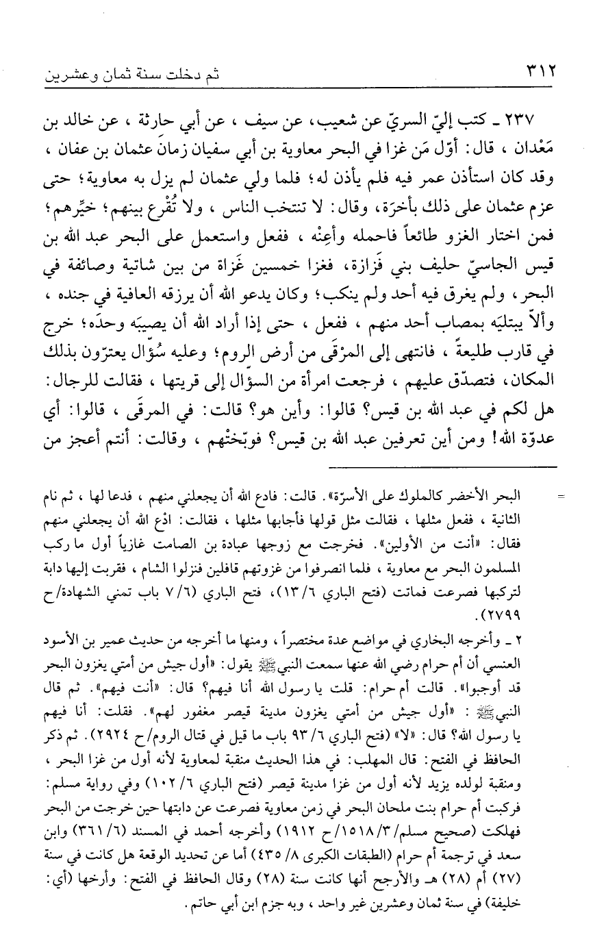 ٢٣٧ - كتب إليّ السريّ عن شعيب، عن سيف، عن أبي حارثة، عن خالد بن مَعْدان، قال: أوّل مَن غزا في البحر معاوية بن أبي سفيان زمانَ عثمان بن عفان، وقد كان استأذن عمر فيه فلم يأذن له؛ فلما ولي عثمان لم يزل به معاوية؛ حتى عزم عثمان على ذلك بأخرَة، وقال: لا تنتخب الناس، ولا تُقْرع بينهم؛ خيِّرهم، فمن اختار الغزو طائعًا فاحمله وأعِنْه، ففعل واستعمل على البحر عبد الله بن قيس الجاسيّ حليف بني فَزازة، فغزا خمسين غَزاة من بين شاتية وصائفة في البحر، ولم يغرق فيه أحد ولم ينكب؛ وكان يدعو الله أن يرزقه العافية في جنده، وألّا يبتليَه بمصاب أحد منهم، ففعل، حتى إذا أراد الله أن يصيبَه وحدَه؛ خرج في قارب طليعةً، فانتهى إلى المرْقَى من أرض الروم، وعليه سُؤّال يعترّون بذلك المكان، فتصدّق عليهم، فرجعت امرأة من السؤّال إلى قريتها، فقالت للرجال: هل لكم في عبد الله بن قيس؟ قالوا: وأين هو؟ قالت: في المرقَى، قالوا: أي عدوّة الله! ومن أين تعرفين عبد الله بن قيس؟ فوبّختْهم، وقالت: أنتم أعجز من