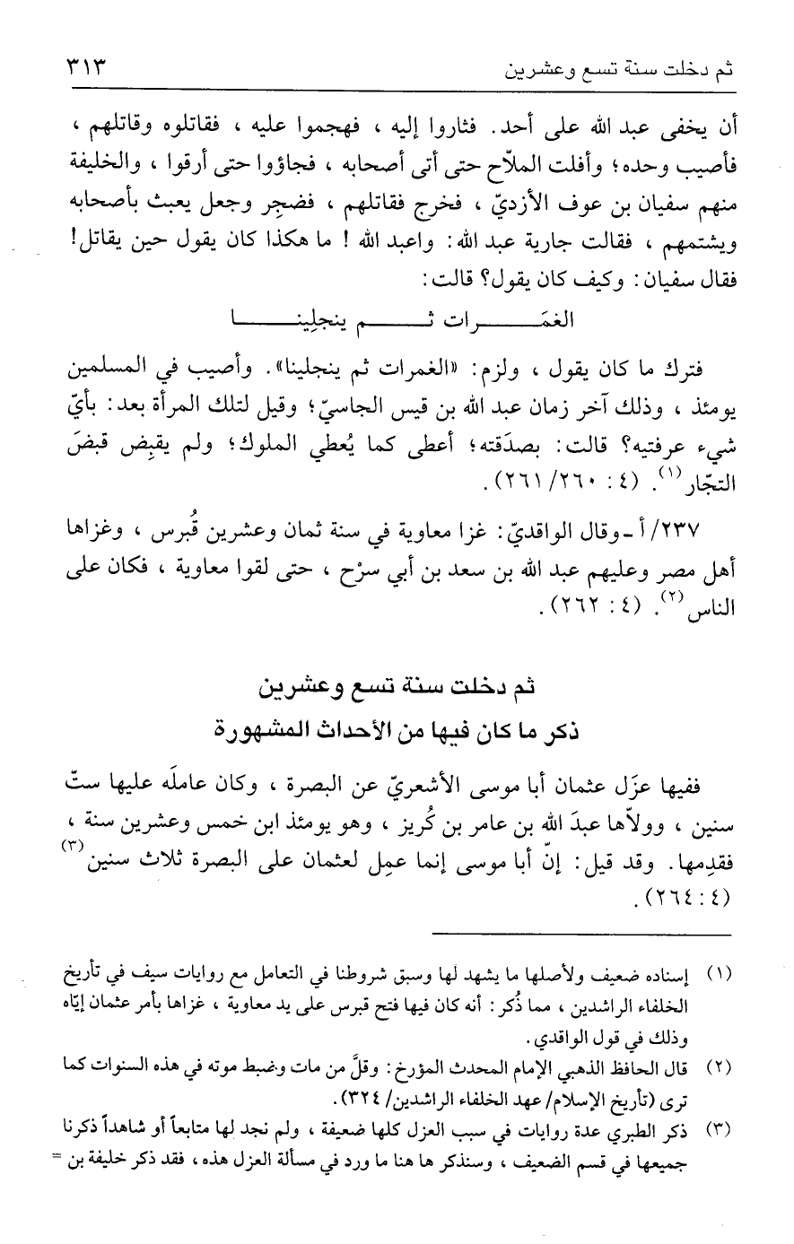 (١) إسناده ضعيف ولأصلها ما يشهد لها وسبق شروطنا في التعامل مع روايات سيف في تأريخ الخلفاء الراشدين، مما ذُكر: أنه كان فيها فتح قبرس على يد معاوية، غزاها بأمر عثمان إيّاه وذلك في قول الواقدي.