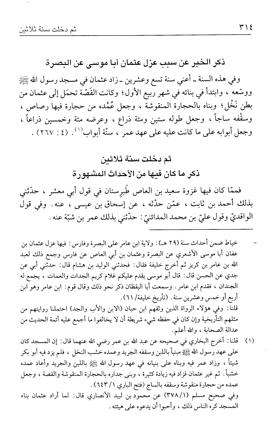 وفي هذه السنة -أعني سنة تسع وعشرين- زاد عثمان في مسجد رسول الله - صلى الله عليه وسلم - ووسّعه، وابتدأ في بنائه في شهر ربيع الأول؛ وكانت القَصّة تحمَل إلى عثمان من بطن نَخْل؛ وبناه بالحجارة المنقوشة، وجعل عُمُده من حجارة فيها رصاص، وسقْفه ساجًا، وجعل طوله ستين ومئة ذراع، وعرضه مئة وخمسين ذراعًا، وجعل أبوابه على ما كانت عليه على عهد عمر، ستّة أبواب (١) (٤: ٢٦٧).