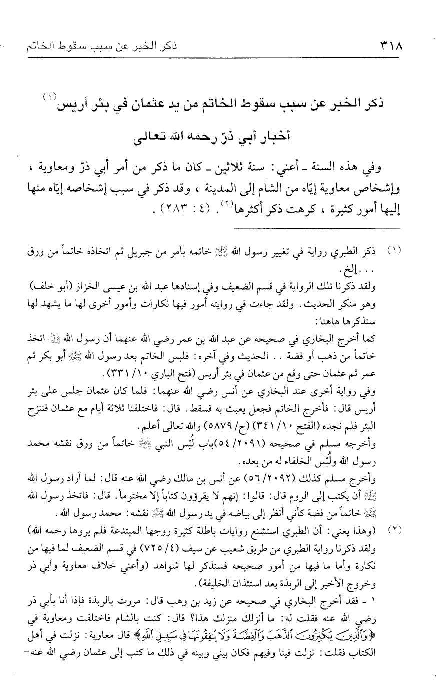 (٢) (وهذا يعني: أن الطبري استشنع روايات باطلة كثيرة روجها المبتدعة فلم يروها رحمه الله) ولقد ذكرنا رواية الطبري من طريق شعيب عن سيف (٤/ ٧٢٥) في قسم الضعيف لما فيها من نكارة وأما ما فيها من أمور صحيحه فسنذكر لها شواهد (وأعني خلاف معاوية وأبي ذر وخروج الأخير إلى الربذة بعد استئذان الخليفة).