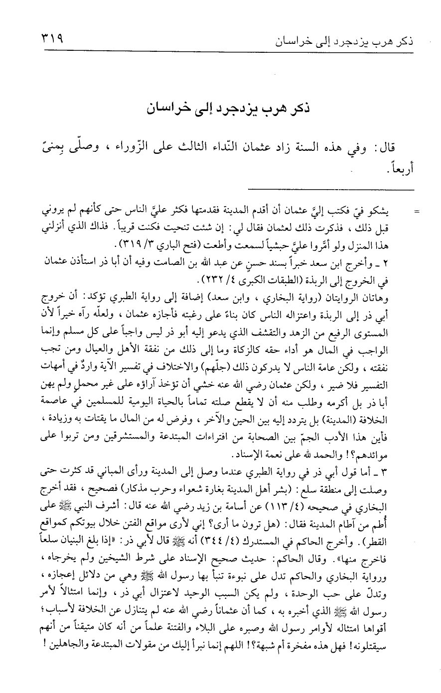 ٣ - أما قول أبي ذر في رواية الطبري عندما وصل إلى المدينة ورأى المباني قد كثرت حتى وصلت إلى منطقة سلع: (بشر أهل المدينة بغارة شعواء وحرب مذكار) فصحيح، فقد أخرج البخاري في صحيحه (٤/ ١١٣) عن أسامة بن زيد رضي الله عنه قال: أشرف النبي - صلى الله عليه وسلم - على أُطم من آطام المدينة فقال: (هل ترون ما أرى؟ إني لأرى مواقع الفتن خلال بيوتكم كمواقع القطر). وأخرج الحاكم في المستدرك (٤/ ٣٤٤) أنه - صلى الله عليه وسلم - قال لأبي ذر: "إذا بلغ البنيان سلعًا فاخرج منها". وقال الحاكم: حديث صحيح الإسناد على شرط الشيخين ولم يخرجاه، ورواية البخاري والحاكم تدل على نبوءة تنبأ بها رسول الله - صلى الله عليه وسلم - وهي من دلائل إعجازه، وتدلّ على حب الموحدة، ولم يكن السبب الوحيد لاعتزال أبي ذر، وإنما امتثالًا لأمر رسول الله - صلى الله عليه وسلم - الذي أخبره به، كما أن عثمانًا رضي الله عنه لم يتنازل عن الخلافة لأسباب؛ أقواها امتثاله لأوامر رسول الله وصبره على البلاء والفتنة علمًا من أنه كان متيقنًا من أنهم سيقتلونه! فهل هذه مفخرة أم شبهة؟ ! اللهم إنما نبرأ إليك من مقولات المبتدعة والجاهلين!