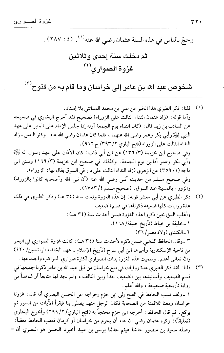 (٢) ذكر الطبري عن أبي معشر قوله: إن هذه الغزوة وقعت سنة (٣٤ هـ) وذكر الطبري في ذلك عدة روايات كلها ضعيفة ذكرناها في قسم الضعيف.