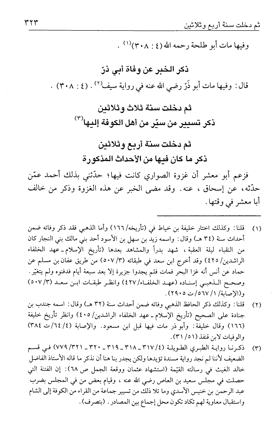 قال: وفيها مات أبو ذَرّ رضي الله عنه في رواية سيف (٢). (٣٠٨: ٤).