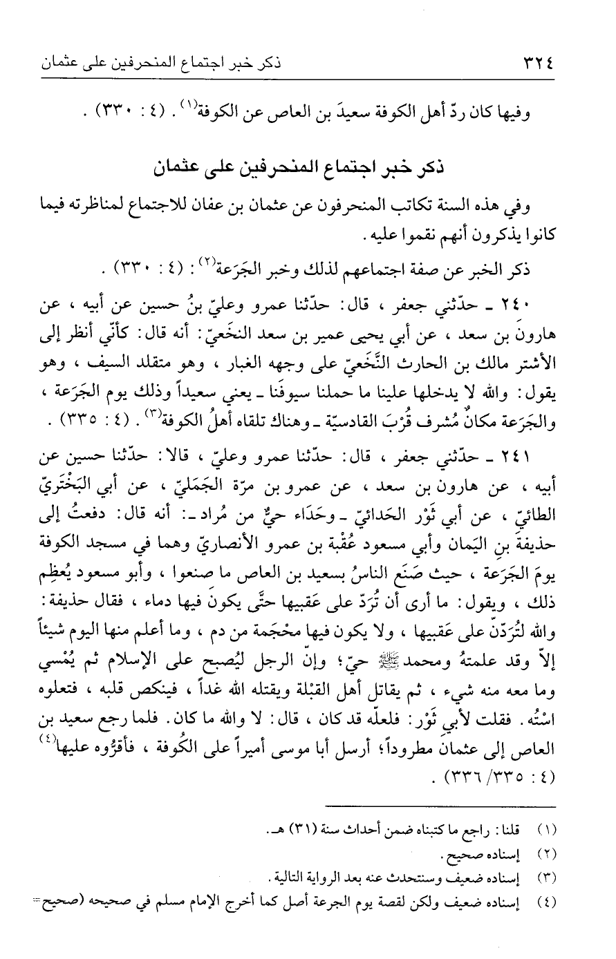 ٢٤١ - حدّثني جعفر، قال: حدَّثنا عمرو وعليّ، قالا: حدَّثنا حسين عن أبيه، عن هارون بن سعد، عن عمرو بن مرّة الجَمَليّ، عن أبي البَخْتَريّ الطائيّ، عن أبي ثَوْر الحَدائيّ - وحَدَاء حيٌّ من مُراد -: أنه قال: دفعتُ إلى حذيفةَ بن اليَمان وأبي مسعود عُقْبة بن عمرو الأنصاريّ وهما في مسجد الكوفة يومَ الجَرَعة، حيث صَنَع الناسُ بسعيد بن العاص ما صنعوا، وأبو مسعود يُعظِم ذلك، ويقول: ما أرى أن تُرَدّ على عَقبيها حتَّى يكونَ فيها دماء، فقال حذيفة: والنّه لتُرَدّنّ على عَقبيها، ولا يكون فيها محْجَمة من دم، وما أعلم منها اليوم شيئًا إلّا وقد علمتهُ ومحمد - صلى الله عليه وسلم - حيّ؛ وإنّ الرجل ليُصبح على الإسلام ثم يُمْسي وما معه منه شيء، ثم يقاتل أهل القبْلة ويقتله الله غدًا، فينكص قلبه، فتعلوه اسْتُه. فقلت لأبي ثَوْر: فلعلّه قد كان، قال: لا والله ما كان. فلما رجع سعيد بن العاص إلى عثمان مطرودًا؛ أرسل أبا موسى أميرًا على الكُوفة، فأقرُّوه عليها (٤) (٤: ٣٣٥/ ٣٣٦).