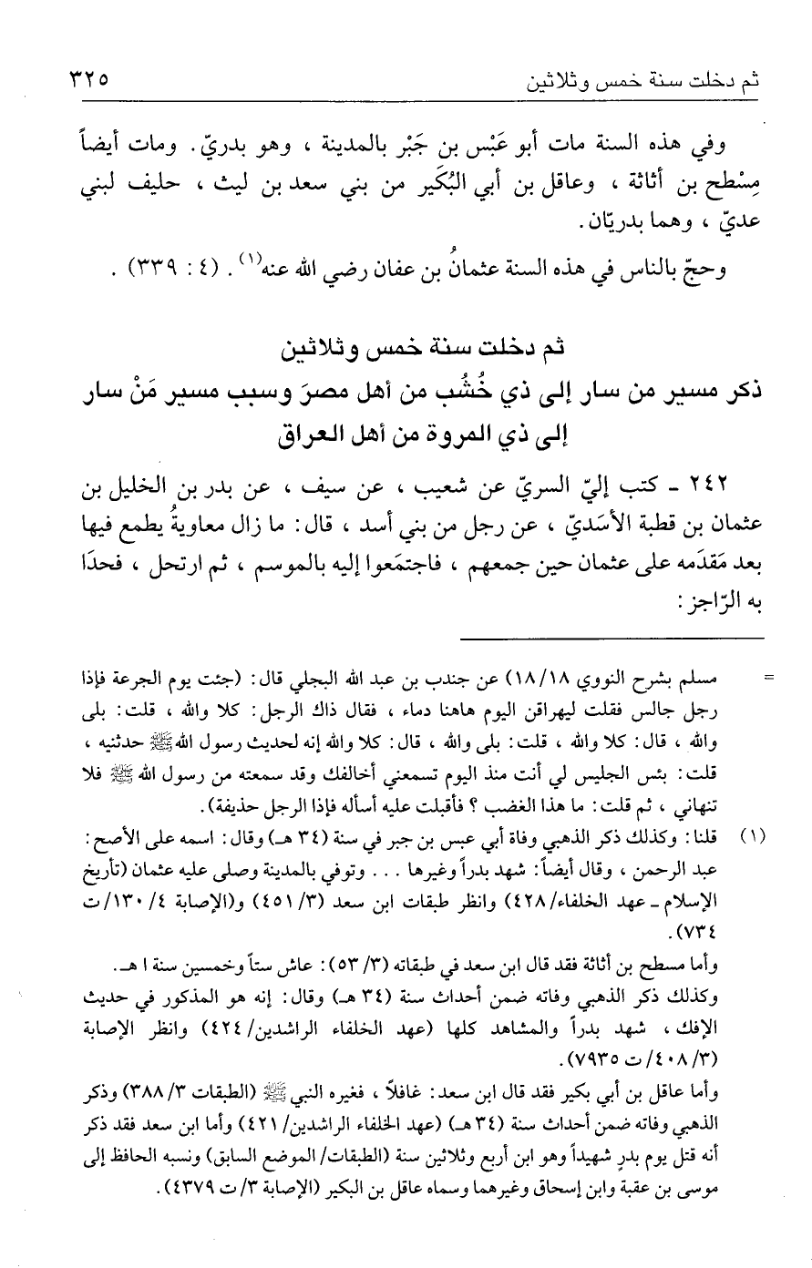 (١) قلنا: وكذلك ذكر الذهبي وفاة أبي عبس بن جبر في سنة (٣٤ هـ) وقال: اسمه على الأصح: عبد الرحمن، وقال أيضًا: شهد بدرًا وغيرها ... وتوفي بالمدينة وصلى عليه عثمان (تأريخ الإسلام - عهد الخلفاء / ٤٢٨) وانظر طبقات ابن سعد (٣/ ٤٥١) و (الإصابة ٤/ ١٣٠ / ت ٧٣٤).