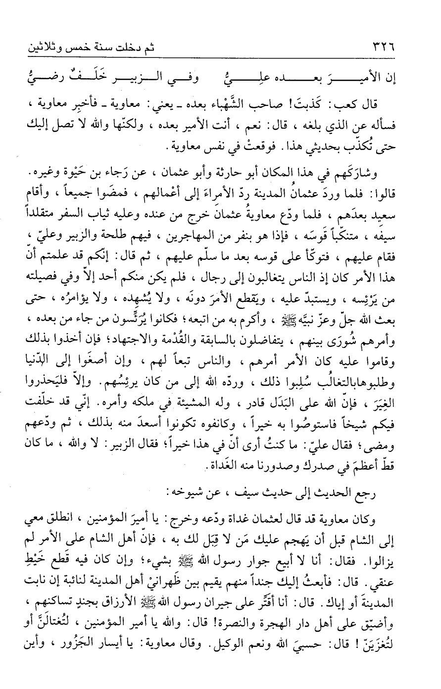 وشارَكَهم في هذا المكان أبو حارثة وأبو عثمان، عن رَجاء بن حَيوة وغيره. قالوا: فلما وردَ عثمانُ المدينة ردّ الأمرِاءَ إلى أعْمالهم، فمضَوا جميعًا، وأقام سعيد بعدَهم، فلما ودّع معاويةُ عثمان خرج من عنده وعليه ثياب السفر متقلدًا سيفه، متنكّبًا قَوسَه، فإذا هو بنفر من المهاجرين، فيهم طلحة والزبير وعليّ، فقام عليهم، فتوكّأ على قوسه بعد ما سلّم عليهم، ثم قال: إنّكم قد علمتم أنّ هذا الأمر كان إذ الناس يتغالبون إلى رجال، فلم يكن منكم أحد إلّا وفي فصيلته من يَرْئِسه، ويستبدّ عليه، وتقطع الأمرَ دونَه، ولا يُشهِده، ولا يؤامرُه، حتى بعث الله جلّ وعزّ نبيَّه - صلى الله عليه وسلم -، وأكرم به من اتبعه، فكانوا يُرَئَسون من جاء من بعده، وأمرهم شُورَى بينهم، يتفاضلون بالسابقة والقُدْمة والاجتهاد؛ فإن أخذوا بذلك وقاموا عليه كان الأمر أمرهم، والناس تبعا لهم، وإن أصغَوا إلى الدّنيا وطلبوها بالتغالُب سُلِبوا ذلك، وردّه الله إلى من كان يرئِسُهم. وإلّا فليَحذروا الغِيَرَ، فإنّ الله على البَدَل قادر، وله المشيئة في ملكه وأمره. إنّي قد خلّفت فيكم شيخًا فاستوصُوا به خيرًا، وكانفوه تكونوا أسعدَ منه بذلك، ثم ودّعهم ومضى؛ فقال عليّ: ما كنتُ أرى أنّ في هذا خيرًا؛ فقال الزبير: لا والله، ما كان قطّ أعظمَ في صدرك وصدورنا منه الغَداة.