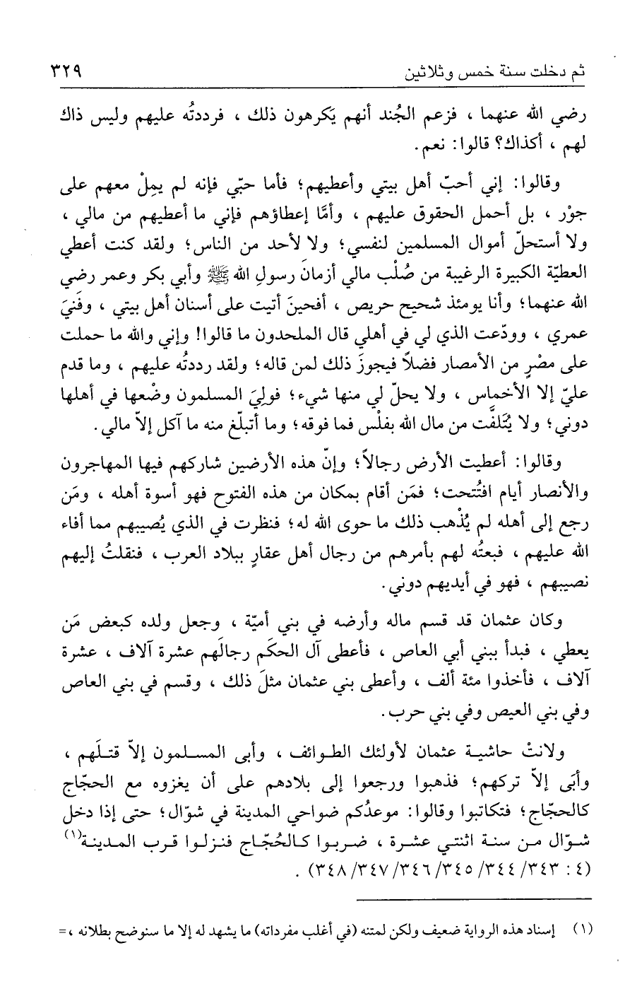 وكان عثمان قد قسم ماله وأرضه في بني أميّة، وجعل ولده كبعض مَن يعطي، فبدأ ببني أبي العاص، فأعطى آل الحكَم رجالهم عشرة آلاف، عشرة آلاف، فأخذوا مئة ألف، وأعطى بني عثمان مثلَ ذلك، وقسم في بني العاص وفي بني العيص وفي بني حرب.