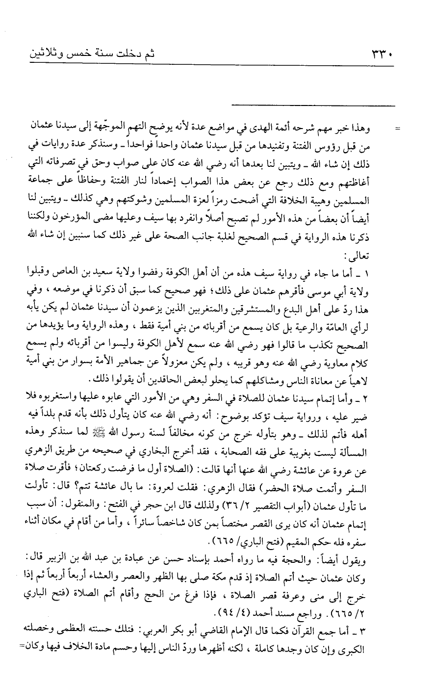 ٢ - وأما إتمام سيدنا عثمان للصلاة في السفر وهي من الأمور التي عابوه عليها واستغربوه فلا ضير عليه، ورواية سيف تؤكد بوضوح: أنه رضي الله عنه كان يتأول ذلك بأنه قدم بلدًا فيه أهله فأتم لذلك - وهو بتأوله خرج من كونه مخالفًا لسنة رسول الله - صلى الله عليه وسلم - لما سنذكر وهذه المسألة ليست بغريبة على فقه الصحابة، فقد أخرج البخاري في صحيحه من طريق الزهري عن عروة عن عائشة رضي الله عنها أنها قالت: (الصلاة أول ما فرضت ركعتان؛ فأقرت صلاة السفر وأتمت صلاة الحضر) فقال الزهري: فقلت لعروة: ما بال عائشة تتم؟ قال: تأولت ما تأول عثمان (أبواب التقصير ٢/ ٣٦) ولذلك قال ابن حجر في الفتح: والمنقول: أن سبب إتمام عثمان أنه كان يرى القصر مختصًا بمن كان شاخصًا سائرًا، وأما من أقام في مكان أثناء سفره فله حكم المقيم (فتح الباري / ٦٦٥).