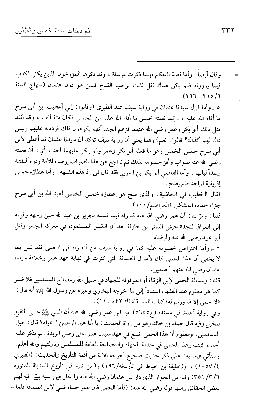 ٦ - وأما اعتراض خصومه عليه كما في رواية سيف من أنه زاد في الحمى فقد تبين بما لا يخفى أن هذا الحمى كان لأموال الصدقة التي كثرت في نهاية عهد عمر وخلافة سيدنا عثمان رضي الله عنهم أجمعين.