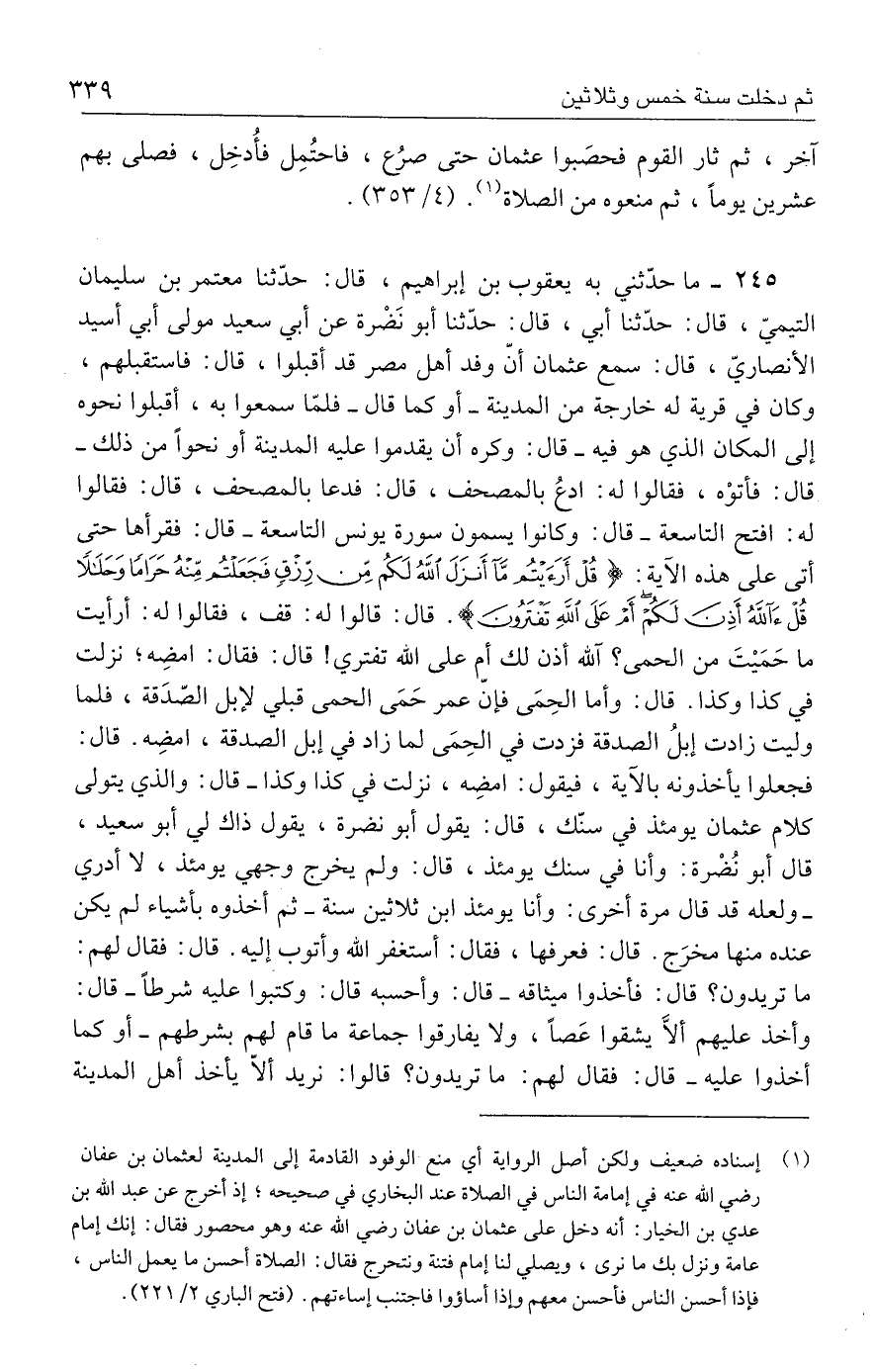 ٢٤٥ - ما حدّثني به يعقوب بن إبراهيم، قال: حدَّثنا معتمر بن سليمان التيميّ، قال: حدَّثنا أبي، قال: حدَّثنا أبو نضْرة عن أبي سعيد مولى أبي أسيد الأنصاريّ، قال: سمع عثمان أنّ وفد أهل مصر قد أقبلوا، قال: فاستقبلهم، وكان في قرية له خارجة من المدينة -أو كما قال- فلمّا سمعوا به، أقبلوا نحوه إلى المكان الذي هو فيه -قال: وكره أن يقدموا عليه المدينة أو نحوًا من ذلك- قال: فأتوْه، فقالوا له: ادعُ بالمصحف، قال: فدعا بالمصحف، قال: فقالوا له: افتح التاسعة - قال: وكانوا يسمون سورة يونس التاسعة - قال: فقرأها حتى أتى على هذه الآية: {قُلْ أَرَأَيتُمْ مَا أَنْزَلَ اللَّهُ لَكُمْ مِنْ رِزْقٍ فَجَعَلْتُمْ مِنْهُ حَرَامًا وَحَلَالًا قُلْ آللَّهُ أَذِنَ لَكُمْ أَمْ عَلَى اللَّهِ تَفْتَرُونَ}. قال: قالوا له: قف، فقالوا له: أرأيت ما حَمَيتَ من الحمى؟ آلله أذن لك أم على الله تفتري! قال: فقال: امضِه؛ نزلت في كذا وكذا. قال: وأما الحِمَى فإنّ عمر حَمَى الحمى قبلي لإبل الصّدَقة، فلما وليت زادت إبلُ الصدقة فزدت في الحِمَى لما زاد في إبل الصدقة، امضِه. قال: فجعلوا يأخذونه بالآية، فيقول: امضِه، نزلت في كذا وكذا - قال: والذي يتولى كلام عثمان يومئذ في سنّك، قال: يقول أبو نضرة، يقول ذاك لي أبو سعيد، قال أبو نُضْرة: وأنا في سنك يومئذ، قال: ولم يخرج وجهي يومئذ، لا أدري - ولعله قد قال مرة أخرى: وأنا يومئذ ابن ثلاثين سنة - ثم أخذوه بأشياء لم يكن عنده منها مخرَج. قال: فعرفها، فقال: أستغفر الله وأتوب إليه. قال: فقال لهم: ما تريدون؟ قال: فأخذوا ميثاقه - قال: وأحسبه قال: وكتبوا عليه شرطًا - قال: وأخذ عليهم ألَّا يشقوا عَصًا، ولا يفارقوا جماعة ما قام لهم بشرطهم -أو كما أخذوا عليه- قال: فقال لهم: ما تريدون؟ قالوا: نريد ألّا يأخذ أهل المدينة
