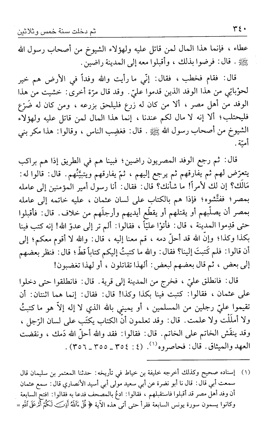 قال: فانطلق عليّ، فخرج من المدينة إلى قرية. قال: فانطلقوا حتى دخلوا على عثمان، فقالوا: كتبت فينا بكذا وكذا! قال: فقال: إنما هما اثنتان: أن تقيموا عليّ رجلين من المسلمين، أو يميني بالله الذي لا إله إلّا هو ما كتبتُ ولا أملَلْت ولا علمت. قال: وقد تعلمون أنّ الكتاب يكتَب على لسان الرّجل، وقد ينقَش الخاتم على الخاتم. قال: فقالوا: فقد والله أحلّ الله دَمك، ونقضت العهد والميثاق. قال: فحاصروه (١). (٤: ٣٥٤ - ٣٥٥ - ٣٥٦).