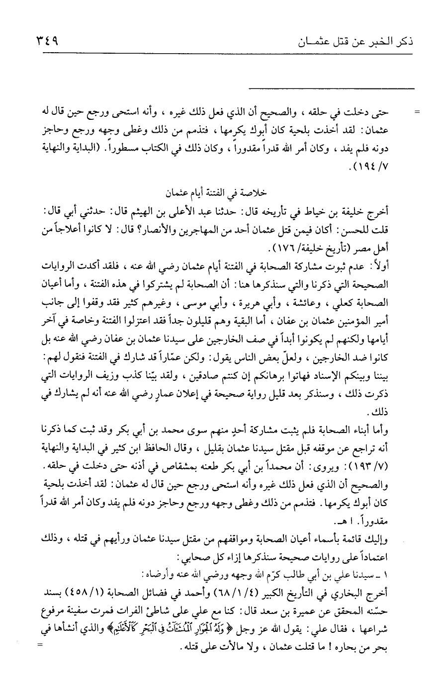 أولًا: عدم ثبوت مشاركة الصحابة في الفتنة أيام عثمان رضي الله عنه، فلقد أكدت الروايات الصحيحة التي ذكرنا والتي سنذكرها هنا: أن الصحابة لم يشتركوا في هذه الفتنة، وأما أعيان الصحابة كعلي، وعائشة، وأبي هريرة، وأبي موسى، وغيرهم كثير فقد وقفوا إلى جانب أمير المؤمنين عثمان بن عفان، أما البقية وهم قليلون جدًّا فقد اعتزلوا الفتنة وخاصة في آخر أيامها ولكنهم لم يكونوا أبدًا في صف الخارجين على سيدنا عثمان بن عفان رضي الله عنه بل كانوا ضد الخارجين، ولعلّ بعض الناس يقول: ولكن عمّارًا قد شارك في الفتنة فنقول لهم: بيننا وبينكم الإسناد فهاتوا برهانكم إن كنتم صادقين، ولقد بيّنا كذب وزيف الروايات التي ذكرت ذلك، وسنذكر بعد قليل رواية صحيحة في إعلان عمارٍ رضي الله عنه أنه لم يشارك في ذلك.