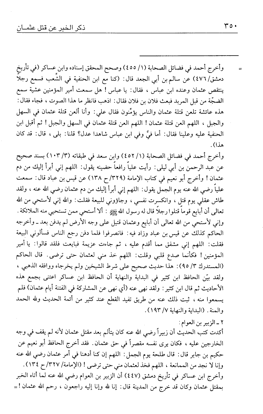 وأخرج أحمد في فضائل الصحابة (١/ ٤٥٢) وابن سعد في طبقاته (٣/ ١٠٣) بسند صحيح عن عبد الرحمن بن أبي ليلى: رأيت عليًّا رافعًا حضينه يقول: اللهم إني أبرأ إليك من دم عثمان! وأخرج أبو نعيم في كتاب الإمامة (٣٢٩ / ح ١٣٨) عن قيس بن عباد قال: سمعت عليًّا رضي الله عنه يوم الجمل يقول: اللهم إني أبرأ إليك من دم عثمان رضي الله عنه، ولقد طاش عقلي يوم قتلٍ، وانكسرت نفسي، وجاؤوني للبيعة فقلت: والله إني لأستحي من الله تعالى أن أبايع قومًا قتلوا رجلًا قال له رسول الله - صلى الله عليه وسلم -: ألا أستحي ممن تستحيي منه الملائكة. وإني لأستحي من الله تعالى أن أبايع وعثمان قتيل على وجه الأرض لم يدفن بعد - وأخرجه الحاكم كذلك عن قيس بن عباد وزاد فيه: فانصرفوا فلما دفن رجع الناس فسألوني البيعة فقلت: اللهم إني مشفق مما أقدم عليه، ثم جاءت عزيمة فبايعت فلقد قالوا: يا أمير المؤمنين! فكأنما صدع قلبي وقلت: اللهم خذ مني لعثمان حتى ترضى. قال الحاكم (المستدرك ٣/ ٩٥): هذا حديث صحيح على شرط الشيخين ولم يخرجاه ووافقه الذهبي، ولقد بيّن الحافظ ابن كثير في البداية والنهاية أن الحافظ ابن عساكر اعتنى بجمع هذه الأحاديث ثم قال ابن كثير: ولقد نهى عنه (أي نهى عن المشاركة في الفتنة أيام عثمان) فلم يسمعوا منه، ثبت ذلك عنه من طريق تفيد القطع عند كثير من أئمة الحديث ولله الحمد والمنة. (البداية والنهاية ٧/ ١٩٣).