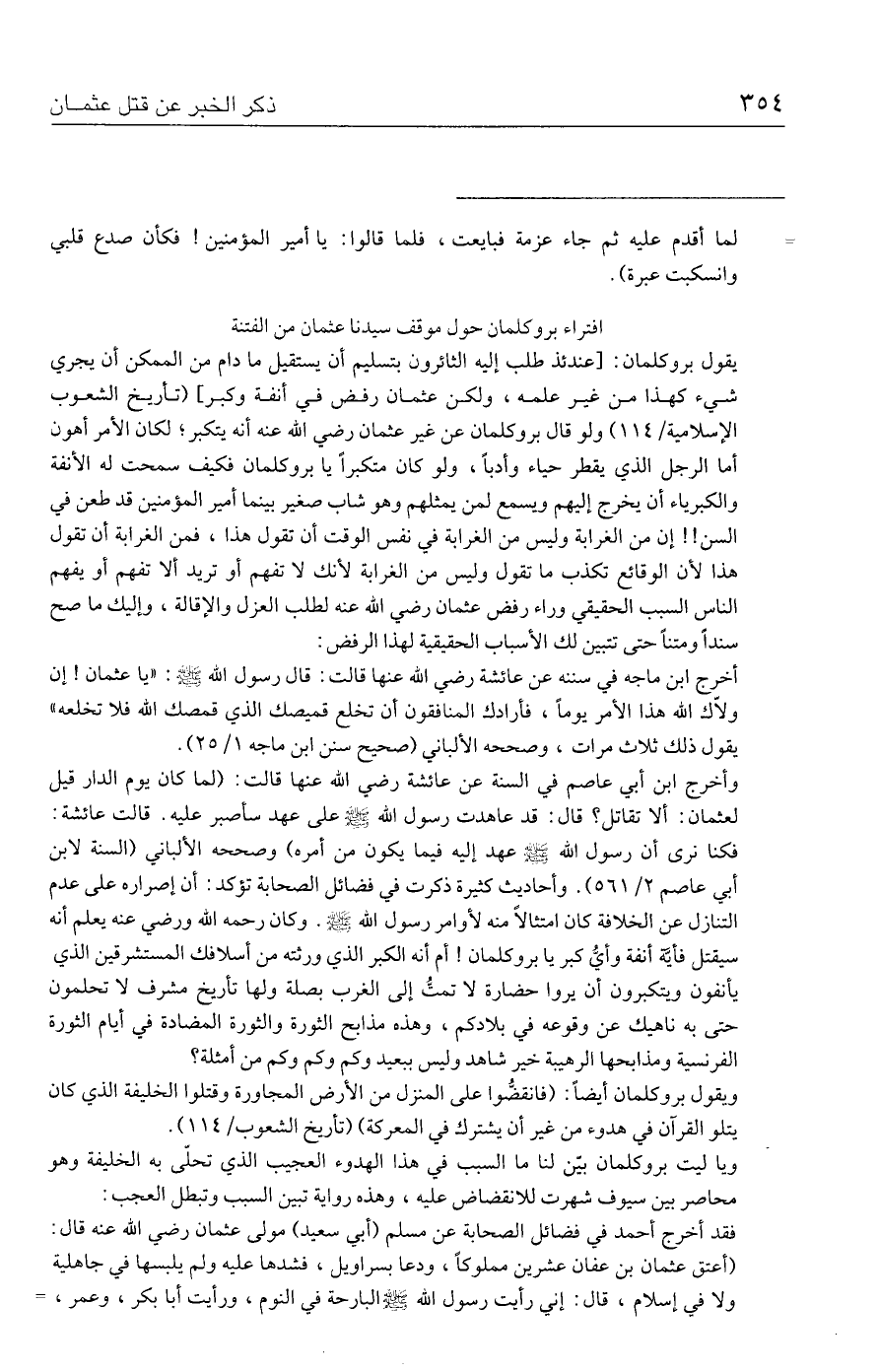 وأخرج ابن أبي عاصم في السنة عن عائشة رضي الله عنها قالت: (لما كان يوم الدار قيل لعثمان: ألا تقاتل؟ قال: قد عاهدت رسول الله - صلى الله عليه وسلم - على عهد سأصبر عليه. قالت عائشة: فكنا نرى أن رسول الله - صلى الله عليه وسلم - عهد إليه فيما يكون من أمره) وصححه الألباني (السنة لابن أبي عاصم ٢/ ٥٦١). وأحاديث كثيرة ذكرت في فضائل الصحابة تؤكد: أن إصراره على عدم التنازل عن الخلافة كان امتثالًا منه لأوامر رسول الله - صلى الله عليه وسلم -. وكان رحمه الله ورضي عنه يعلم أنه سيقتل فأيَّة أنفة وأيُّ كبر يا بروكلمان! أم أنه الكبر الذي ورثته من أسلافك المستشرقين الذي يأنفون ويتكبرون أن يروا حضارة لا تمتُّ إلى الغرب بصلة ولها تأريخ مشرف لا تحلمون حتى به ناهيك عن وقوعه في بلادكم، وهذه مذابح الثورة والثورة المضادة في أيام الثورة الفرنسية ومذابحها الرهيبة خير شاهد وليس ببعيد وكم وكم وكم من أمثلة؟