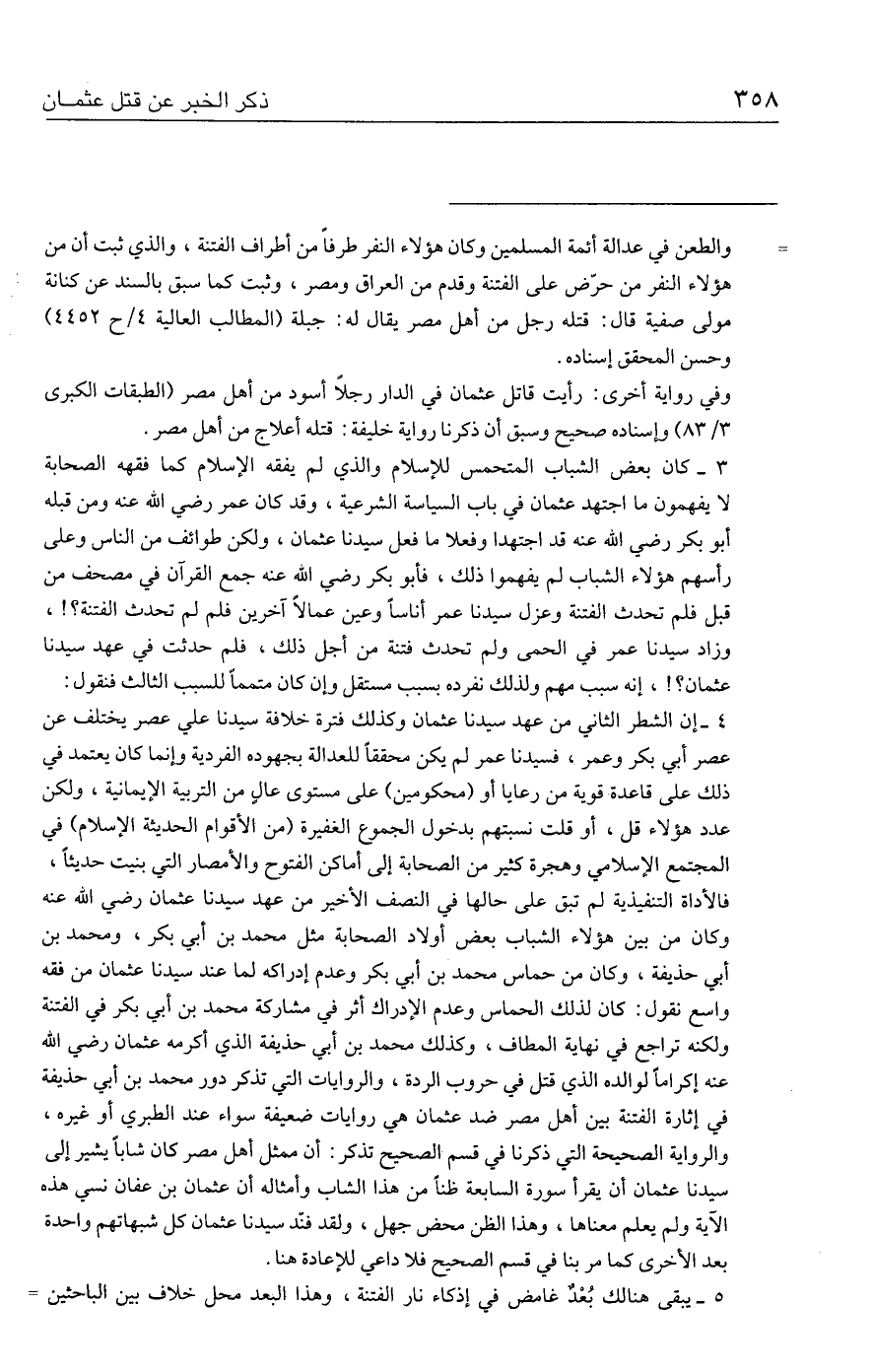 ٤ - إن الشطر الثاني من عهد سيدنا عثمان وكذلك فترة خلافة سيدنا علي عصر يختلف عن عصر أبي بكر وعمر، فسيدنا عمر لم يكن محققًا للعدالة بجهوده الفردية وإنما كان يعتمد في ذلك على قاعدة قوية من رعايا أو (محكومين) على مستوى عالي من التربية الإيمانية، ولكن عدد هؤلاء قل، أو قلت نسبتهم بدخول الجموع الغفيرة (من الأقوام الحديثة الإسلام) في المجتمع الإسلامي وهجرة كثير من الصحابة إلى أماكن الفتوح والأمصار التي بيت حديثًا، فالأداة التنفيذية لم تبق على حالها في النصف الأخير من عهد سيدنا عثمان رضي الله عنه وكان من بين هؤلاء الشباب بعض أولاد الصحابة مثل محمد بن أبي بكر، ومحمد بن أبي حذيفة، وكان من حماس محمد بن أبي بكر وعدم إدراكه لما عند سيدنا عثمان من فقه واسع نقول: كان لذلك الحماس وعدم الإدراك أثر في مشاركة محمد بن أبي بكر في الفتنة ولكنه تراجع في نهاية المطاف، وكذلك محمد بن أبي حذيفة الذي أكرمه عثمان رضي الله عنه إكرامًا لوالده الذي قتل في حروب الردة، والروايات التي تذكر دور محمد بن أبي حذيفة في إثارة الفتنة بين أهل مصر ضد عثمان هي روايات ضعيفة سواء عند الطبري أو غيره، والرواية الصحيحة التي ذكرنا في قسم الصحيح تذكر: أن ممثل أهل مصر كان شابًّا يشير إلى سيدنا عثمان أن يقرأ سورة السابعة ظنًّا من هذا الأب وأمثاله أن عثمان بن عفان نسي هذه الآية ولم يعلم معناها، وهذا الظن محض جهل، ولقد فند سيدنا عثمان كل شبهاتهم واحدة بعد الأخرى كما مر بنا في قسم الصحيح فلا داعي للإعادة هنا.
