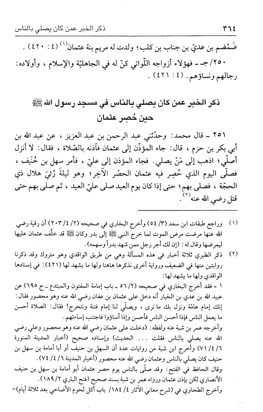 ٢٥١ - قال محمد: وحدّثني عبد الرحمن بن عبد العزيز، عن عبد الله بن أبي بكر بن حزم، قال: جاء المؤذّن إلى عثمان فآذنه بالصّلاة، فقال: لا أنزل أصلّي؛ اذهب إلى مَنْ يصلي. فجاء المؤذن إلى عليّ، فأمر سهل بن حُنَيف، فصلّى اليوم الذي حُصِر فيه عثمان الحصر الآخِر؛ وهو ليلةَ رُئيَ هلال ذي الحجّة، فصلى بهم؛ حتى إذا كان يوم العيد صلى عليَّ العيد، ثم صلى بهم حتى قتل رضي الله عنه (٢).
