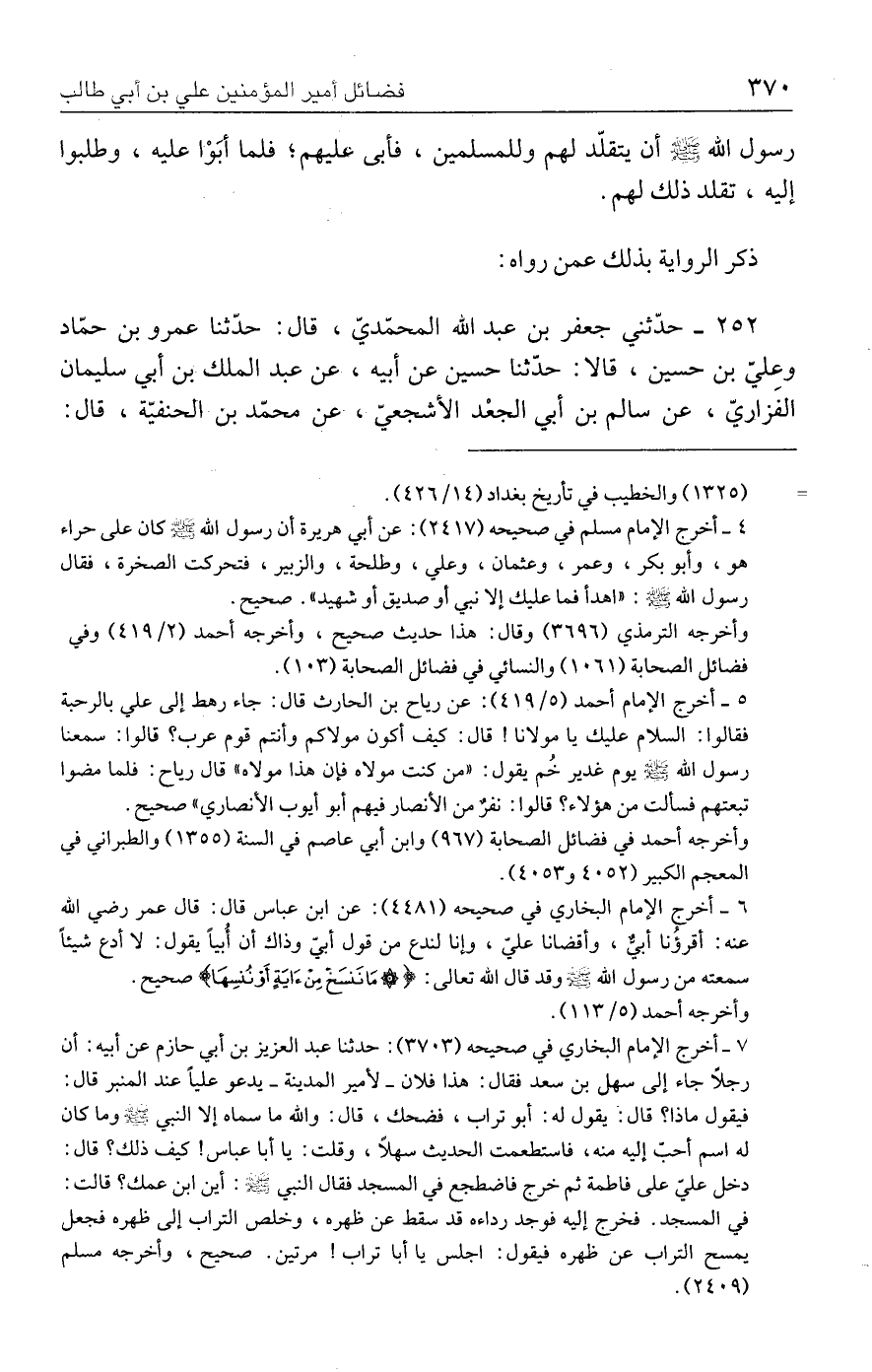 ٥ - أخرج الإمام أحمد (٥/ ٤١٩): عن رياح بن الحارث قال: جاء رهط إلى علي بالرحبة فقالوا: السلام عليك يا مولانا! قال: كيف أكون مولاكم وأنتم قوم عرب؟ قالوا: سمعنا رسول الله - صلى الله عليه وسلم - يوم غدير خُم يقول: "من كنت مولاه فإن هذا مولاه" قال رياح: فلما مضوا تبعتهم فسألت من هؤلاء؟ قالوا: نفرٌ من الأنصار فيهم أبو أيوب الأنصاري" صحيح.