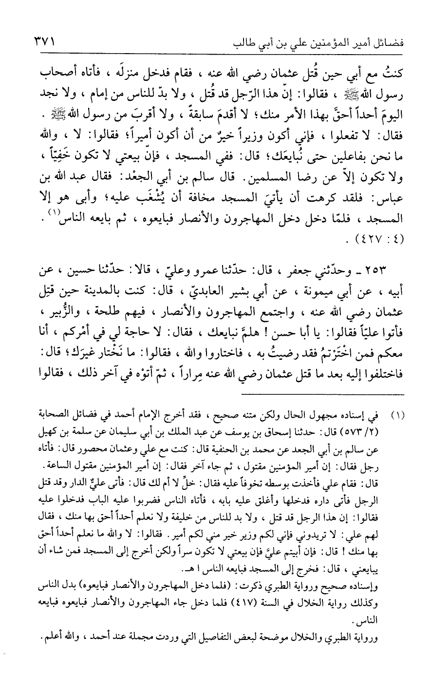 ٢٥٣ - وحدّثني جعفر، قال: حدَّثنا عمرو وعليّ، قالا: حدَّثنا حسين، عن أبيه، عن أبي ميمونة، عن أبي بشير العابديّ، قال: كنت بالمدينة حين قتِل عثمان رضي الله عنه، واجتمع المهاجرون والأنصار، فيهم طلحة، والزُّبير، فأتوا عليًّا فقالوا: يا أبا حسن! هلمَّ نبايعك، فقال: لا حاجة لي في أمْركم، أنا معكم فمن اخْتَرْتمُ فقد رضيتُ به، فاختاروا والله، فقالوا: ما نَخْتار غيرَك؛ قال: فاختلفوا إليه بعد ما قتل عثمان رضي الله عنه مِرارًا، ثم أتوْه في آخر ذلك، فقالوا
