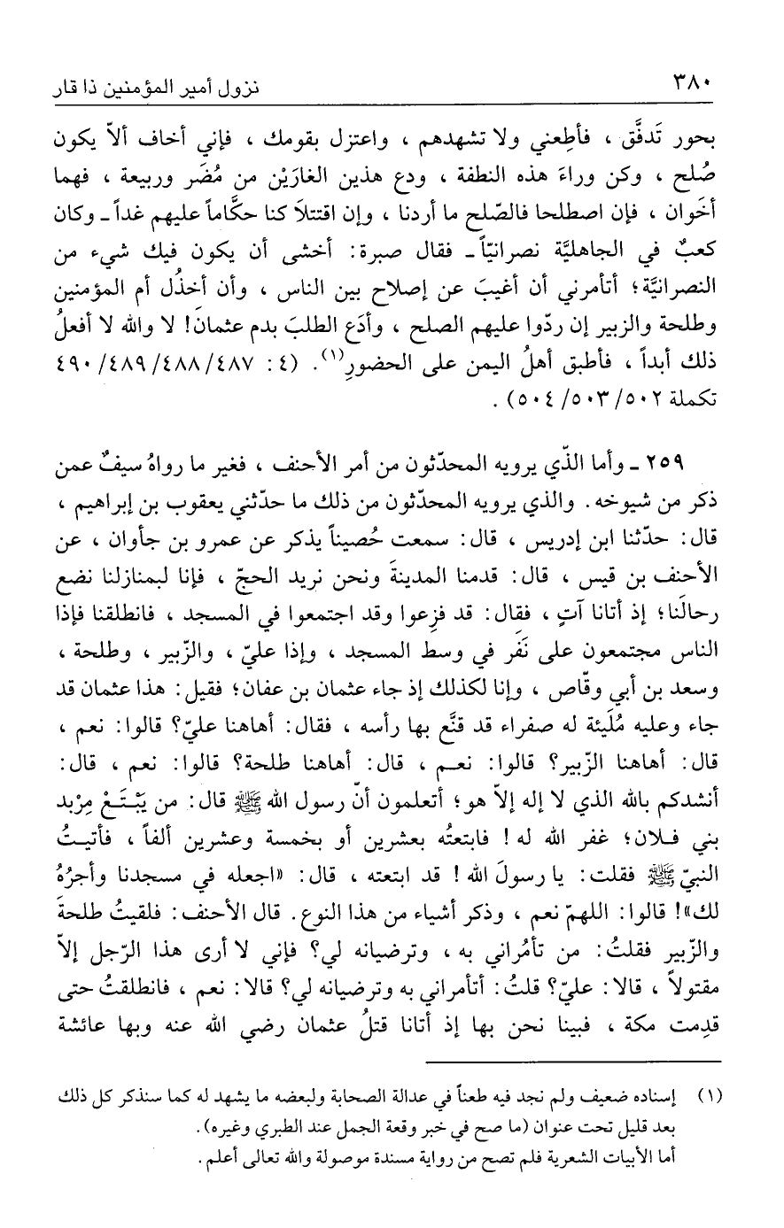 ٢٥٩ - وأما الذي يرويه المحدّثون من أمر الأحنف، فغير ما رواهُ سيفٌ عمن ذكر من شيوخه. والذي يرويه المحدّثون من ذلك ما حدّثني يعقوب بن إبراهيم، قال: حدَّثنا ابن إدريس، قال: سمعت حُصينًا يذكر عن عمرو بن جأوان، عن الأحنف بن قيس، قال: قدمنا المدينةَ ونحن نريد الحجّ، فإنا لبمنازلنا نضع رحالنا؛ إذ أتانا آتٍ، فقِال: قد فزِعوا وقد اجتمعوا في المسجد، فانطلقنا فإذا الناس مجتمعون على نَفر في وسط المسجد، وإذا عليّ، والزّبير، وطلحة، وسعد بن أبي وقّاص، وإنا لكذلك إذ جاء عثمان بن عفان؛ فقيل: هذا عثمان قد جاء وعليه مُلَيئة له صفراء قد قنَّع بها رأسه، فقال: أهاهنا عليّ؟ قالوا: نعم، قال: أهاهنا الزُّبَيْر؟ قالوا: نعم، قال: أهاهنا طلحة؟ قالوا: نعم، قال: أنشدكم بالله الذي لا إله إلّا هو؛ أتعلمون أنّ رسول الله - صلى الله عليه وسلم - قال: من يبتَعْ مِرْبد بني فلان؛ غفر الله له! فابتعتُه بعشرين أو بخمسة وعشرين ألفًا، فأتيتُ النبيّ - صلى الله عليه وسلم - فقلت: يا رسولَ الله! قد ابتعته، قال: "اجعله في مسجدنا وأجرُهُ لك"! قالوا: اللهمّ نعم، وذكر أشياء من هذا النوع. قال الأحنف: فلقيتُ طلحةَ والزّبير فقلتُ: من تأمُراني به، وترضيانه لي؟ فإني لا أرى هذا الرّجل إلّا مقتولًا، قالا: عليّ؟ قلتُ: أتأمراني به وترضيانه لي؟ قالا: نعم، فانطلقتُ حتى قدِمت مكة، فبينا نحن بها إذ أتانا قتلُ عثمان رضي الله عنه وبها عائشة