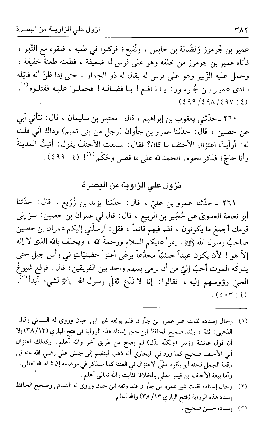 ٢٦١ - حدَّثنا عمرو بن عليّ، قال: حدَّثنا يزيد بن زُرَيع، قال: حدَّثنا أبو نعامة العدويّ عن حُجَير بن الربيع، قال: قال لي عمران بن حصين: سرْ إلى قومك أجمعَ ما يكونون، فقم فيهم قائمًا، فقل: أرسلَني إليكم عمران بن حصين صاحبُ رسول الله - صلى الله عليه وسلم -، يقرأ عليكم السلام ورحمةَ الله، ويحلف بالله الذي لا إله إلَّا هو! لأن يكون عبدًا حبشيًّا مجدَّعًا يرعَى أعنزًا حضنيّاتٍ في رأس جبل حتى يدركَه الموت أحبّ إليّ من أن يرمى بسهم واحد بين الفريقين؛ قال: فرفع شيوخُ الحيّ رؤوسهم إليه، فقالوا: إنا لا نَدَع ثقلَ رسول الله - صلى الله عليه وسلم - لشيء أبدًا (٣).