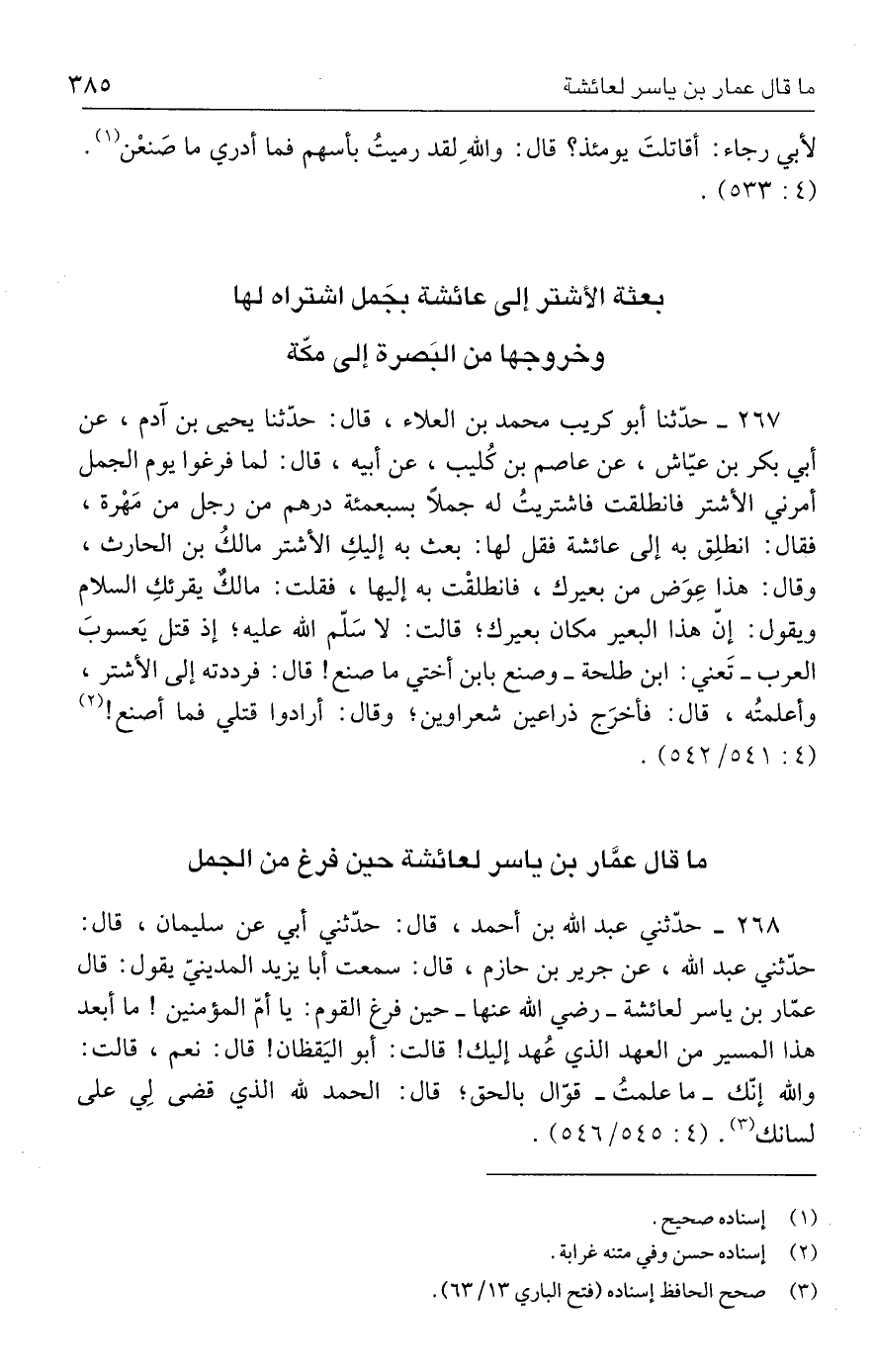 ٢٦٧ - حدَّثنا أبو كريب محمد بن العلاء، قال: حدَّثنا يحيى بن آدم، عن أبي بكر بن عيّاش، عن عاصم بن كُليب، عن أبيه، قال: لما فرغوا يوم الجمل أمرني الأشتر فانطلقت فاشتريتُ له جملًا بسبعمئة درهم من رجل من مَهْرة، فقال: انطلِق به إلى عائشة فقل لها: بعث به إليكِ الأشتر مالكُ بن الحارث، وقال: هذا عِوَض من بعيرك، فانطلقْت به إليها، فقلت: مالكٌ يقرئكِ السلام ويقول: إنّ هذا البعير مكان بعيرك؛ قالت: لا سَلّم الله عليه؛ إذ قتل يَعسوبَ العرب -تَعني: ابن طلحة- وصنع بابن أختي ما صنع! قال: فرددته إلى الأشتر، وأعلمتُه، قال: فأخرَج ذراعين شعراوين؛ وقال: أرادوا قتلي فما أصنع! (٢) (٤: ٥٤١/ ٥٤٢).