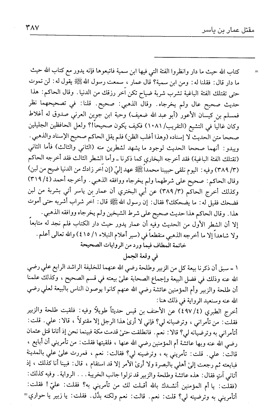 = كتاب الله حيث ما دار وانظروا الفئة التي فيها ابن سمية فاتبعوها فإنه يدور مع كتاب الله حيث ما دار قال: فقلنا له: ومن ابن سمية؟ قال عمار، سمعت رسول الله - صلى الله عليه وسلم - يقول له: لن تموت حتى تقتلك الفئة الباغية تشرب شربة ضياح تكن آخر رزقك من الدنيا. وقال الحاكم: هذا حديث صحيح عال ولم يخرجاه. وقال الذهبي: صحيح. قلنا: في تصحيحهما نظر فمسلم بن كيسان الأعور (أبو عبد الله ضعيف) وحبة ابن جوين العرني صدوق له أغلاط وكان غاليًا في التشيع (التقريب / ١٠٨١) فكيف يكون صحيحًا! ؟ ولعل الحافظين الجليلين صححا متن الحديث لا إسناده (وهذا أغلب الظن) فلم يقل الحاكم صحيح الإسناد والذهبي.