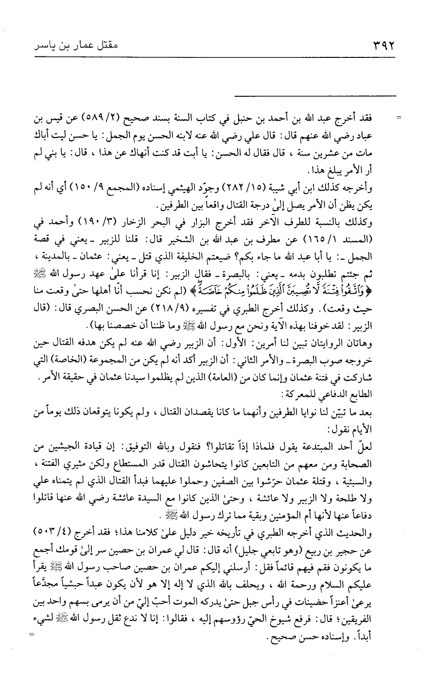 والحديث الذي أخرجه الطبري في تأريخه خير دليل على كلامنا هذا؛ فقد أخرج (٤/ ٥٠٣) عن حجير بن ربيع (وهو تابعي جليل) أنه قال: قال لي عمران بن حصين سر إلى قومك أجمع ما يكونون فقم فيهم قائمًا فقل: أرسلني إليكم عمران بن حصين صاحب رسول الله - صلى الله عليه وسلم - يقرأ عليكم السلام ورحمة الله، ويحلف بالله الذي لا إله إلا هو لأن يكون عبدًا حبشيًّا مجدَّعًا يرعى أعنزًا حضينات في رأس جبل حتى يدركه الموت أحبّ إليّ من أن يرمى بسهم واحد بين الفريقين؛ قال: فرفع شيوخ الحيّ رؤوسهم إليه، فقالوا: إنا لا ندع ثقل رسول الله - صلى الله عليه وسلم - لشيء أبدًا. وإسناده حسن صحيح. =