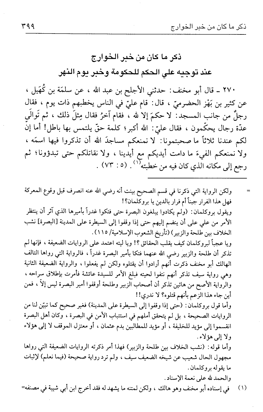 وأما قوله: (نشب الخلاف بين طلحة والزبير) فهذا أمر ذكرته الروايات الضعيفة التي رواها مجهول الحال شعيب عن شيخه الضعيف سيف، ولم ترد رواية صحيحة (فيما نعلم) لإثبات ما يقوله بروكلمان.