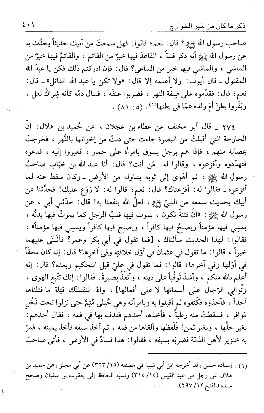 ٢٧٤ - قال أبو مخنف عن عطاء بن عجلان، عن حُميد بن هلال: إنّ الخارجة التي أقبلتْ من البصرة جاءت حتى دنتْ من إخوانها بالنَّهر، فخرجتْ عِصابة منهم، فإذا هم برجل يسوق بامرأة على حمار، فعبروا إليه، فدعوه فتهدّدوه وأفزعوه، وقالوا له: مَن أنت؟ قال: أنا عبد الله بن خبّاب صاحبُ رسول الله - صلى الله عليه وسلم -، ثم أهَوى إلى ثوبه يتناوله من الأرض - وكان سقط عنه لما أفزعوه - فقالوا له: أفزعناك؟ قال: نعم؛ قالوا له: لا رَوْع عليك! فحدِّثنا عن أبيك بحديث سمعه من النبيّ - صلى الله عليه وسلم -، لعلّ الله ينفعنا به! قال: حدّثني أبي، عن رسول الله - صلى الله عليه وسلم -: "أنّ فتنة تكون، يموت فيها قلبُ الرجل كما يموتُ فيها بدنُه، يمسِي فيها مؤمنًا ويصبحُ فيها كافرًا، ويصبح فيها كافرًا ويمسِي فيها مؤمنًا"، فقالوا: لهذا الحديث سألناك، [فما تقول في أبي بكر وعمر؟ فأثَنَى عليهما خيرًا، قالوا: ما تقول في عثمانَ في أوّل خلافته وفي آخرِها؟ قال: إنه كان محقًّا في أوّلها وفي آخرها؛ قالوا: فما تقول في عليّ قبل التحكيم وبعده؟ قال: إنه أعلم بالله منكم، وأشدّ تَوقِّيًا على دينه، وأنفَذُ بصيرةً. فقالوا: إنك تتّبع الهوى، وتُوالِي الرّجال على أسمائها لا على أفعالها]، والله لنقتلنّك قتِلة ما قتلناها أحدًا، فأخذوه فكَتفوه ثم أقبلوا به وبامرأته وهي حُبلى مُتِمٌّ حتى نزلوا تحت نَخْل مَواقر، فسقطتْ منه رطبةٌ، فأخذها أحدهم فقذف بها في فمه، فقال أحدهم: بغير حلِّها، وبغير ثمن! فَلَفظها وألقاها من فمه، ثم أخذ سيفه فأخذ يمينه، فمرّ به خنزير لأهل الذمّة فضربَه بسيفه، فقالوا: هذا فسادٌ في الأرض، فأتى صاحبَ