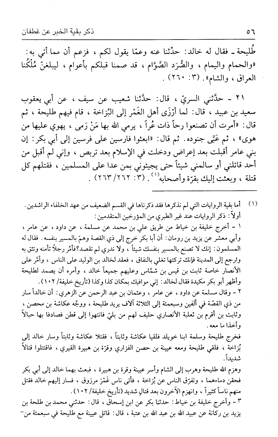 ٢١ - حدَّثني السريّ، قال: حدَّثنا شعيب عن سيف، عن أبي يعقوب سعيد بن عبيد، قال: لما أرْزَى أهل الغَمْر إلى البُزاخة، قام فيهم طليحة، ثم قال: "أمرت أن تصنعوا رحًا ذات عُرًا، يرمي الله بها مَنْ رَمى، يهوي عليها من هوى"، ثم عَبَّى جنوده. ثم قال: "ابعنَوا فارسين على فرسين إلى أبي بكر: إن بني عامر أقبلت بعد إعراض ودخلت في الإسلام بعد تربص، وإني لي أقبل من أحد قاتلني أو سالمني شيئًا حتى يجيئوني بمن عدا على المسلمين، فقتلهم كل قتلة، وبعثت إليك بقرّة وأصحابه (١). (٣: ٢٦٢/ ٢٦٣).