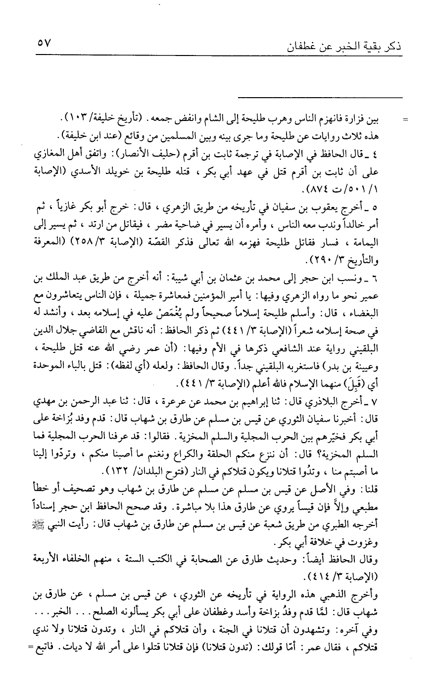 ٦ - ونسب ابن حجر إلى محمد بن عثمان بن أبي شيبة: أنه أخرج من طريق عبد الملك بن عمير نحو ما رواه الزهري وفيها: يا أمير المؤمنين فمعاشرة جميلة، فإن الناس يتعاشرون مع البغضاء، قال: وأسلم طليحة إسلامًا صحيحًا ولم يُغْمَصْ عليه في إسلامه بعد، وأنشد له في صحة إسلامه شعرًا (الإصابة ٣/ ٤٤١) ثم ذكر الحافظ: أنه ناقش مع القاضي جلال الدين البلقيني رواية عند الشافعي ذكرها في الأم وفيها: (أن عمر رضي الله عنه قتل طليحة، وعيينة بن بدر) فاستغربه البلقيني جدًّا. وقال الحافظ: ولعله (أي لفظه): قتل بالباء الموحدة أي (قَبِلَ) منهما الإسلام فالله أعلم (الإصابة ٣/ ٤٤١).