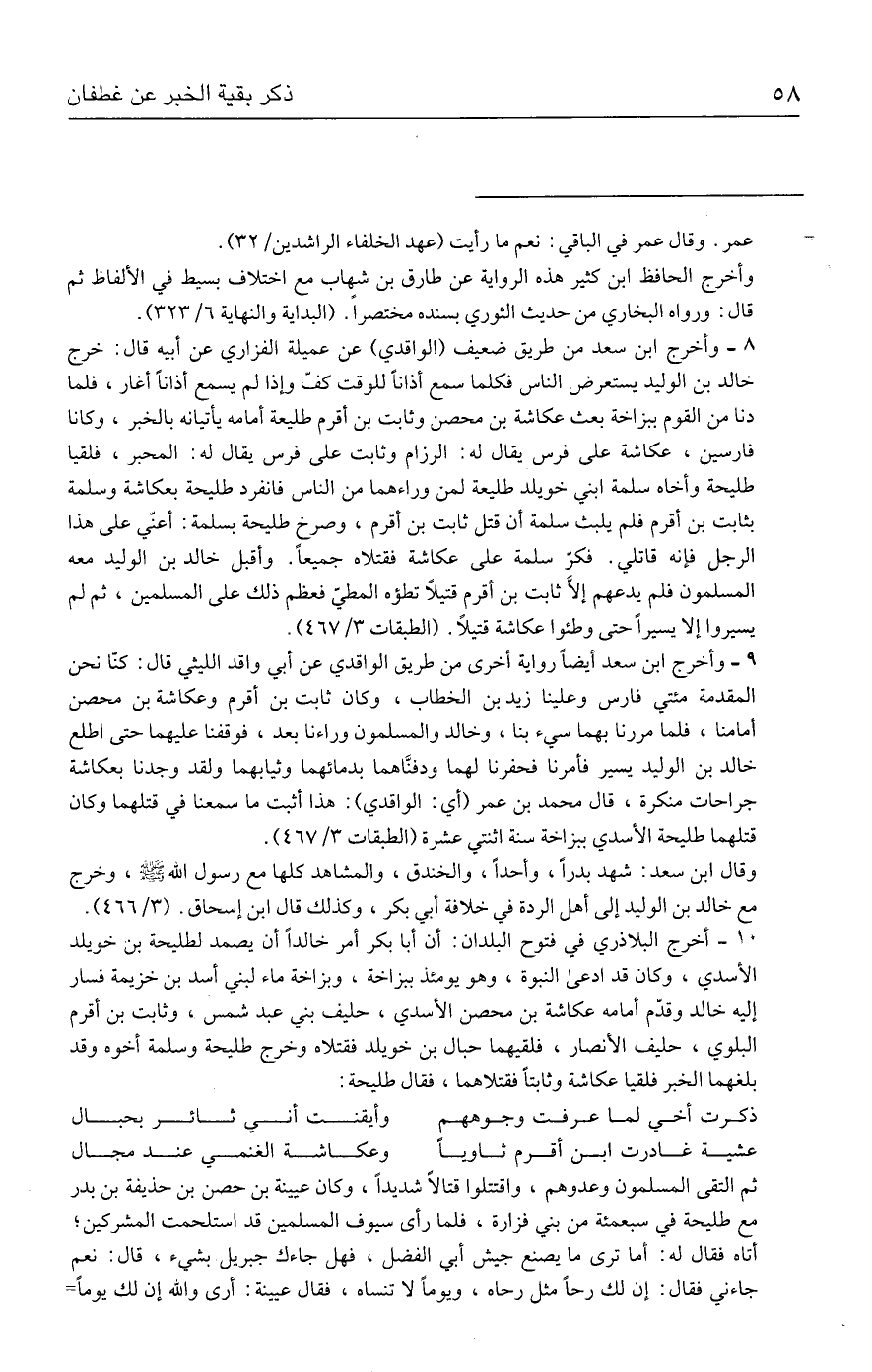 ٨ - وأخرج ابن سعد من طريق ضعيف (الواقدي) عن عميلة الفزاري عن أبيه قال: خرج خالد بن الوليد يستعرض الناس فكلما سمع أذانًا للوقت كفّ وإذا لم يسمع أذانًا أغار، فلما دنا من القوم ببزاخة بعث عكاشة بن محصن وثابت بن أقرم طليعة أمامه يأتيانه بالخبر، وكانا فارسين، عكاشة على فرس يقال له: الرزام وثابت على فرس يقال له: المحبر، فلقيا طليحة وأخاه سلمة ابني خويلد طليعة لمن وراءهما من الناس فانفرد طليحة بعكاشة وسلمة بثابت بن أقرم فلم يلبث سلمة أن قتل ثابت بن أقرم، وصرخ طليحة بسلمة: أعنّي على هذا الرجل فإنه قاتلي. فكرّ سلمة على عكاشة فقتلاه جميعًا. وأقبل خالد بن الوليد معه المسلمون فلم يدعهم إلَّا ثابت بن أقرم قتيلًا تطؤه المطيّ فعظم ذلك على المسلمين، ثم لم يسيروا إلا يسيرًا حتى وطئوا عكاشة قتيلًا. (الطقبات ٣/ ٤٦٧).