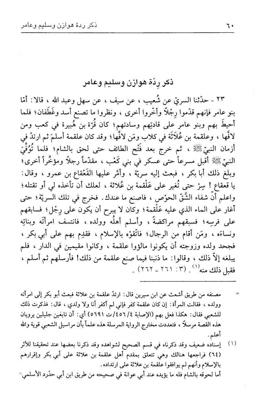 ٢٣ - حدَّثنا السريّ عن شُعيب، عن سيف، عن سهل وعبد الله، قالا: أمّا بنو عامر فإنهم قدّموا رِجْلًا وأخروا أخرى، ونظروا ما تصنع أسد وغَطَفان؛ فلما أحيطَ بهم وبنو عامر على قادتِهم وسادتهم؛ كان قُرّة بن هُبيرة في كعب ومن لافَّها، وعلقمة بن عُلاثَة في كلاب ومَن لافَّها؛ وقد كان علقمة أسلمَ ثم ارتدّ في أزمان النبيّ - صلى الله عليه وسلم -، ثم خرج بعد فَتْح الطائف حتى لحق بالشام؛ فلما تُوُفِّيَ النبيّ - صلى الله عليه وسلم - أقبل مسرعًا حتى عسكر في بني كَعْب، مقدّمًا رجلًا ومؤخِّرًا أخرى؛ وبلغ ذلك أبا بكر، فبعث إليه سريّة، وأمَّر عليها القَعْقاع بن عمرو، وقال: يا قعقاع! سِرْ حتى تُغير على عَلْقمة بن عُلاثة، لعلك أن تأخذه لي أو تقتله؛ واعلم أنّ شفاء الشَّق الحوْص، فاصنع ما عندك. فخرج في تلك السريّة؛ حتى أغار على الماء الذي عليه عَلْقمة؛ وكان لا يبرح أن يكون على رِجْل؛ فسابقهم على فرسِه؛ فسبقهم مراكضةً، وأسلم أهلُه وولده، فانتسف امرأتَه وبناتِه ونساءَه، ومَن أقام من الرجال؛ فاتّقوْه بالإسلام، فقدِم بهم على أبي بكر، فجحد ولده وزوجته أن يكونوا مالؤوا علقمة، وكانوا مقيمين في الدار، فلم يبلغه إلّا ذلك، وقالوا: ما ذنبنا فيما صنع علقمة من ذلك! فأرسلهم ثم أسلم، فقبل ذلك منه (١). (٣: ٢٦١ - ٢٦٢).
