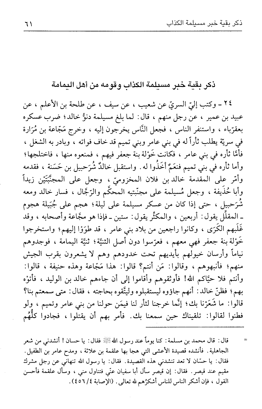 ٢٤ - وكتب إليّ السريّ عن شعيب، عن سيف، عن طلحة بن الأعلم، عن عبيد بن عمير، عن رجل منهم، قال: لما بلغ مسيلمة دنوُّ خالد؛ ضرب عسكره بعقرّباء، واستنفر الناس، فجعل النَّاس يخرجون إليه، وخرج مَجّاعة بن مُرَارة في سريّة يطلب ثأرًا له في بني عامر وبني تميم قد خاف فواته، وبادر به الشغل، فأمَّا ثأره في بني عامر، فكانت خَوْلة بنة جعفر فيهم، فمنعوه منها، فاختلجها؛ وأما ثأره في بني تميم فنعَمٌ أخَذُوا له. واستقبل خالدٌ شُرَحبيل بن حَسَنة، فقدمه وأمّر على المقدمة خالد بن فلان المخزوميّ، وجعل على المجنَّبتَين زيدًا وأبا حُذَيفة، وجعل مُسيلمة على مجنّبتيه المحكَّم والرّجَّال، فسار خالد ومعه شُرَحبيل، حتى إذا كان من عسكر مسيلمة على ليلة؛ هجم على جُبَيلة هجوم - المقلِّل يقول: أربعين، والمكثِّر يقول: ستين - فإذا هو مجَّاعة وأصحابه، وقد غَلَبهم الكَرَى، وكانوا راجعين من بلاد بني عامر، قد طوَوْا إليهم؛ واستخرجوا خَوْلة بنة جعفر فهي معهم، فعرّسوا دون أصل الثنيَّة؛ ثنيَّة اليمامة، فوجدوهم نيامًا وأرسان خيولهم بأيديهم تحت خدودهم وهم لا يشعرون بقرب الجيش منهم؛ فأنبهوهم، وقالوا: مَن أنتم؟ قالوا: هذا مَجّاعة وهذه حنيفة، قالوا: وأنتم فلا حيَّاكم الله! فأوثقوهم وأقاموا إلى أن جاءهم خالد بن الوليد، فأتوْه بهم؛ فظنّ خالد: أنهم جاؤوه ليستقبلوه وليتَّقوه بحاجته، فقال: متى سمعتم بنا؟ قالوا: ما شَعَرْنا بك؛ إنَّما خرجنا لثأر لنا فيمَن حولنا من بني عامر وتميم، ولو فطنوا لقالوا: تلقيناك حين سمعنا بك. فأمر بهم أن يقتلوا، فجادوا كلُّهُم