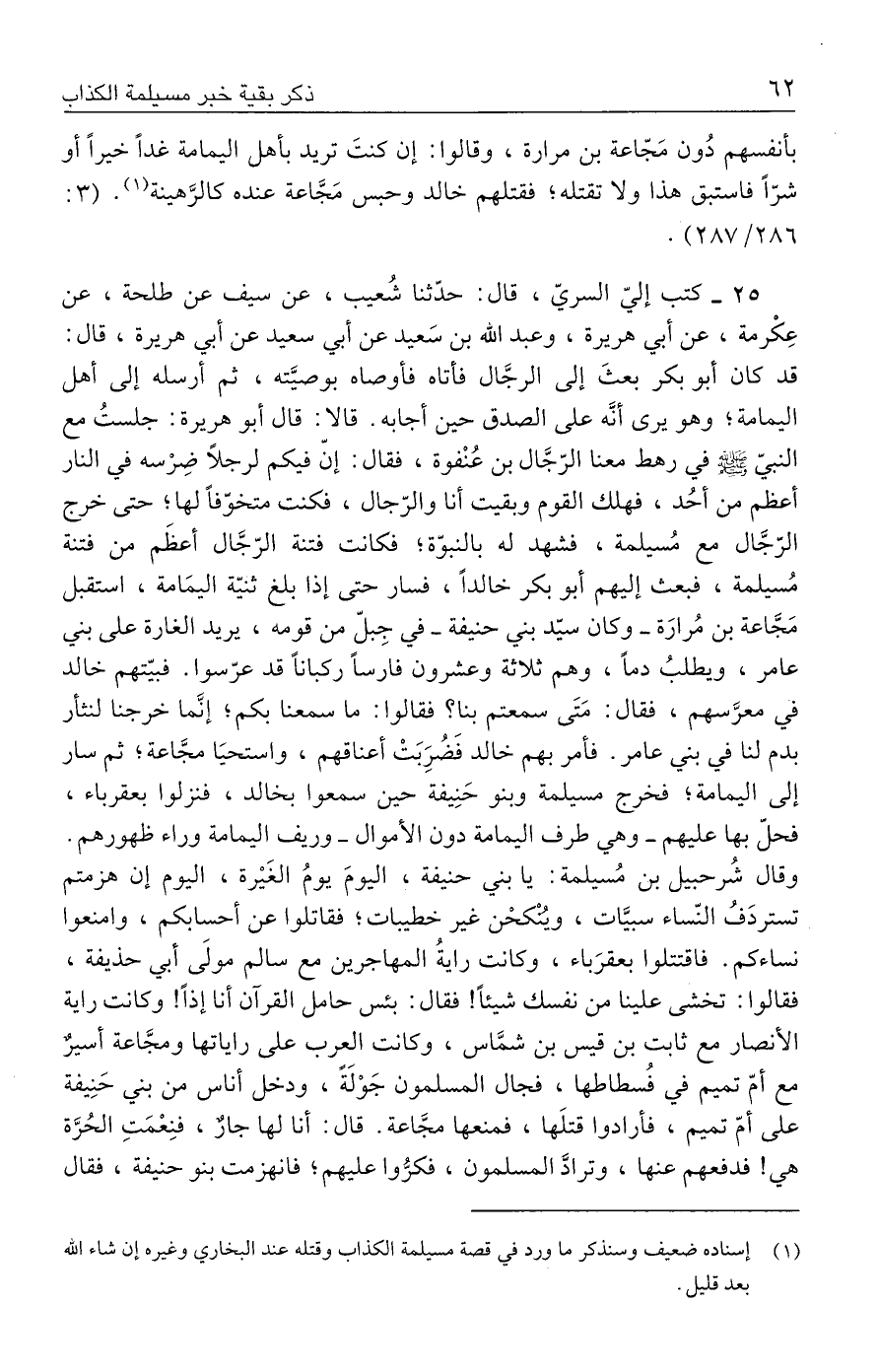 ٢٥ - كتب إليّ السريّ، قال: حدَّثنا شُعيب، عن سيف عن طلحة، عن عِكْرمة، عن أبي هريرة، وعبد الله بن سَعيد عن أبي سعيد عن أبي هريرة، قال: قد كان أبو بكر بعثَ إلى الرجَّال فأتاه فأوصاه بوصيَّته، ثم أرسله إلى أهل اليمامة؛ وهو يرى أنَّه على الصدق حين أجابه. قالا: قال أبو هريرة: جلستُ مع النبيّ - صلى الله عليه وسلم - في رهط معنا الرّجَّال بن عُنْفوة، فقال: إنّ فيكم لرجلًا ضِرْسه في النار أعظم من أحُد، فهلك القوم وبقيت أنا والرّجال، فكنت متخوّفًا لها؛ حتى خرج الرّجَّال مع مُسيلمة، فشهد له بالنبوّة؛ فكانت فتنة الرّجَّال أعظَم من فتنة مُسيلمة، فبعث إليهم أبو بكر خالدًا، فسار حتى إذا بلغ ثنيّة اليمَامة، استقبل مَجَّاعة بن مُرارَة - وكان سيّد بني حنيفة - في جِبلّ من قومه، يريد الغارة علي بني عامر، ويطلبُ دمًا، وهم ثلاثة وعشرون فارسًا ركبانًا قد عرّسوا. فبيّتهم خالد في معرَّسهم، فقال: مَتَى سمعتم بنا؟ فقالوا: ما سمعنا بكم؛ إنَّما خرجنا لنثأر بدم لنا في بني عامر. فأمر بهم خالد فَضُرِبَتْ أعناقهم، واستحيَا مجَّاعة؛ ثم سار إلى اليمامة؛ فخرج مسيلمة وبنو حَنِيفة حين سمعوا بخالد، فنزلوا بعقرباء، فحلّ بها عليهم - وهي طرف اليمامة دون الأموال - وريف اليمامة وراء ظهورهم. وقال شُرحبيل بن مُسيلمة: يا بني حنيفة، اليومَ يومُ الغَيرة، اليوم إن هزمتم تستردَفُ النّساء سبيَّات، ويُنْكحْن غير خطيبات؛ فقاتلوا عن أحسابكم، وامنعوا نساءكم. فاقتتلوا بعقرَباء، وكانت رايةُ المهاجرين مع سالم مولَى أبي حذيفة، فقالوا: تخشى علينا من نفسك شيئًا! فقال: بئس حامل القرآن أنا إذًا! وكانت راية الأنصار مع ثابت بن قيس بن شمَّاس، وكانت العرب على راياتها ومجَّاعة أسيرٌ مع أمّ تميم في فُسطاطها، فجال المسلمون جَوْلَة، ودخل أناس من بني حَنِيفة على أمّ تميم، فأرادوا قتلَها، فمنعها مجَّاعة. قال: أنا لها جارٌ، فنِعْمَتِ الحُرَّة هي! فدفعهم عنها، وترادَّ المسلمون، فكرُّوا عليهم؛ فانهزمت بنو حنيفة، فقال