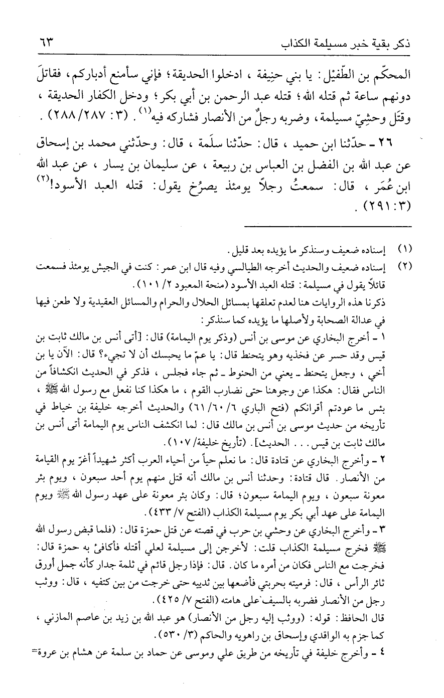 ٢٦ - حدَّثنا ابن حميد، قال: حدَّثنا سلَمة، قال: وحدّثني محمد بن إسحاق عن عبد الله بن الفضل بن العباس بن ربيعة، عن سليمان بن يسار، عن عبد الله بن عُمَر، قال: سمعتُ رجلًا يومئذ يصرُخ يقول: قتله العبد الأسود! (٢) (٢٩١: ٣).