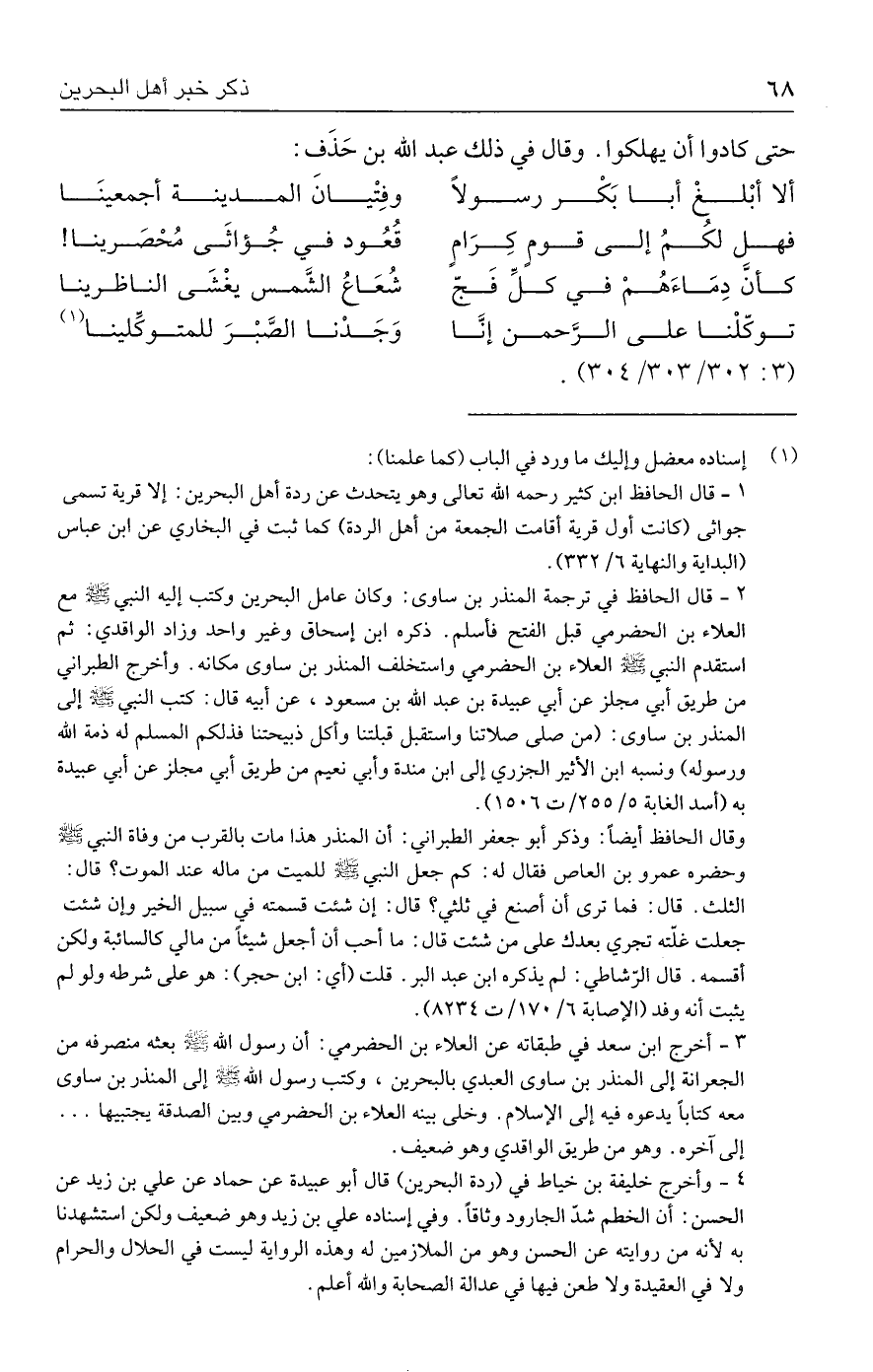 ٣ - أخرج ابن سعد في طبقاته عن العلاء بن الحضرمي: أن رسول الله - صلى الله عليه وسلم - بعثه منصرفه من الجعرانة إلى المنذر بن ساوى العبدي بالبحرين، وكتب رسول الله - صلى الله عليه وسلم - إلى المنذر بن ساوى معه كتابًا يدعوه فيه إلى الإسلام. وخلى بينه العلاء بن الحضرمي وبين الصدقة يجتبيها ... إلى آخره. وهو من طريق الواقدي وهو ضعيف.