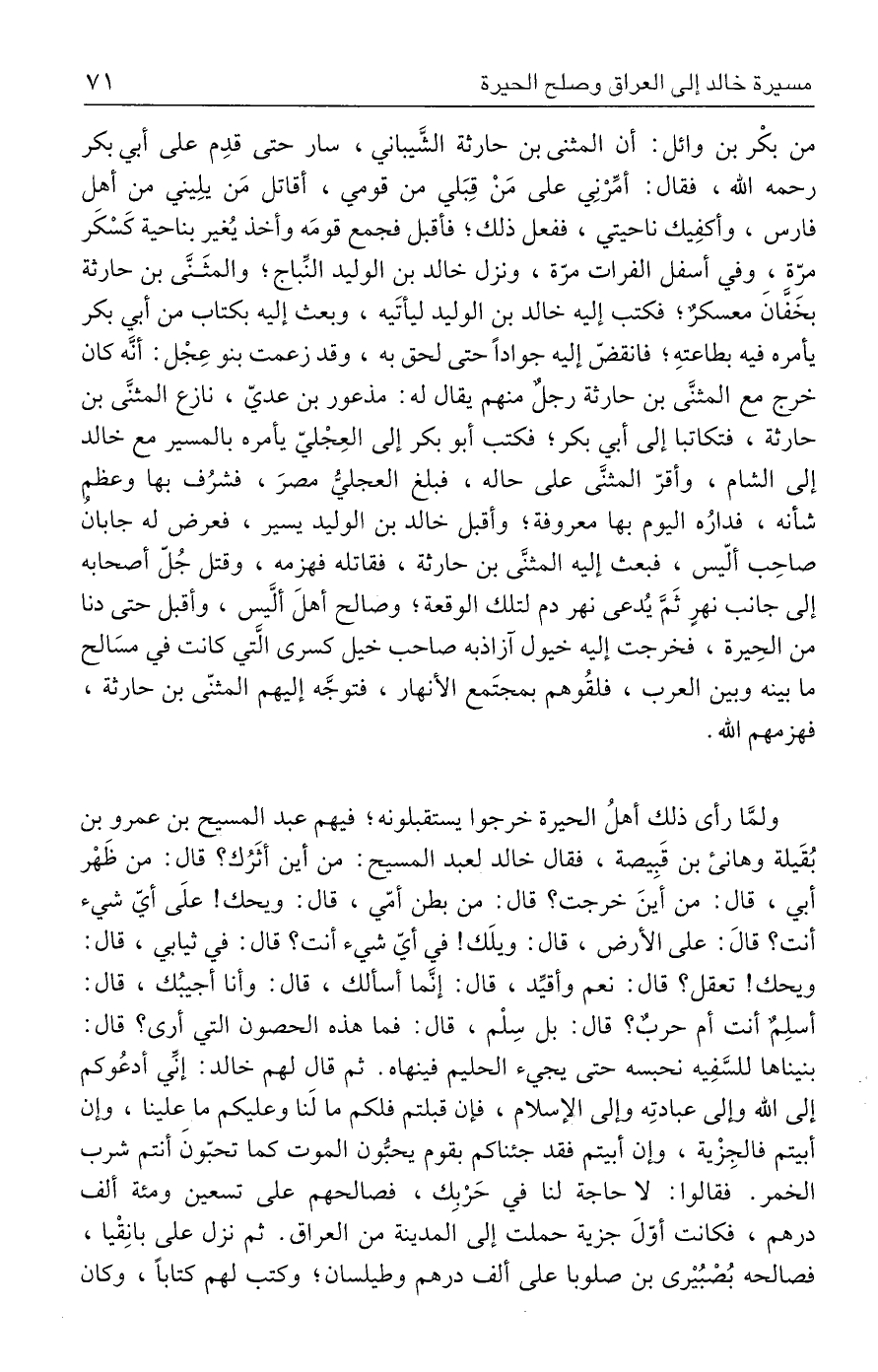 ولمَّا رأى ذلك أهلُ الحيرة خرجوا يستقبلونه، فيهم عبد المسيح بن عمرو بن بُقَيلة وهانئ بن قَبيصة، فقال خالد لعبد المسيح: من أين أثَرُك؟ قال: من ظَهْر أبي، قال: من أيَنَ خرجت؟ قال: من بطن أمّي، قال: ويحك! علَى أيّ شيء أنت؟ قال: على الأرض، قال: ويلَك! في أقي شيء أنت؟ قال: في ثيابي، قال: ويحك! تعقل؟ قال: نعم وأقيِّد، قال: إنَّما أسألك، قال: وأنا أجيبُك، قال: أسلِمٌ أنت أم حربٌ؟ قال: بل سِلْم، قال: فما هذه الحصون التي أرى؟ قال: بنيناها للسَّفِيه نحبسه حتى يجيء الحليم فينهاه. ثم قال لهم خالد: إنِّي أدعُوكم إلى الله وإلى عبادتِه وإلى الإسلام، فإن قبلتم فلكم ما لَنا وعليكم ما علينا، وإن أبيتم فالجِزْية، وإن أبيتم فقد جئناكم بقوم يحبُّون الموت كما تحبّونَ أنتم شرب الخمر. فقالوا: لا حاجة لنا في حَرْبِك، فصالحهم على تسعين ومئة ألف درهم، فكانت أوّلَ جزية حملت إلى المدينة من العراق. ثم نزل على بانِقْيا، فصالحه بُصْبُيرى بن صلوبا على ألف درهم وطيلسان، وكتب لهم كتابًا، وكان