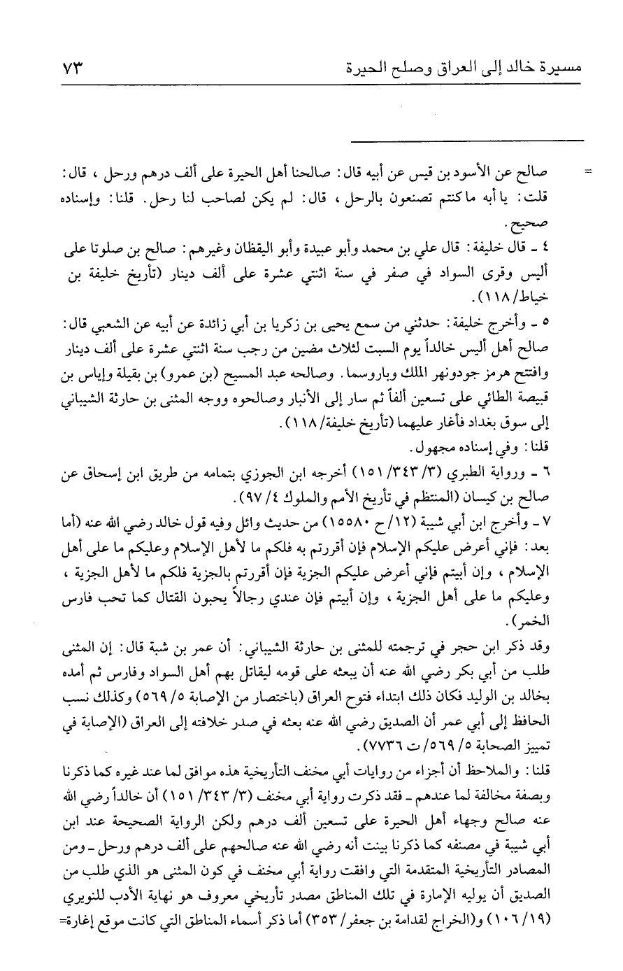 ٥ - وأخرج خليفة: حدثني من سمع يحيى بن زكريا بن أبي زائدة عن أبيه عن الشعبي قال: صالح أهل أليس خالدًا يوم السبت لثلاث مضين من رجب سنة اثنتي عشرة على ألف دينار وافتتح هرمز جودونهر الملك وباروسما. وصالحه عبد المسيح (بن عمرو) بن بقيلة وإياس بن قبيصة الطائي على تسعين ألفًا ثم سار إلى الأنبار وصالحوه ووجه المثنى بن حارثة الشيباني إلى سوق بغداد فأغار عليهما (تأريخ خليفة / ١١٨).