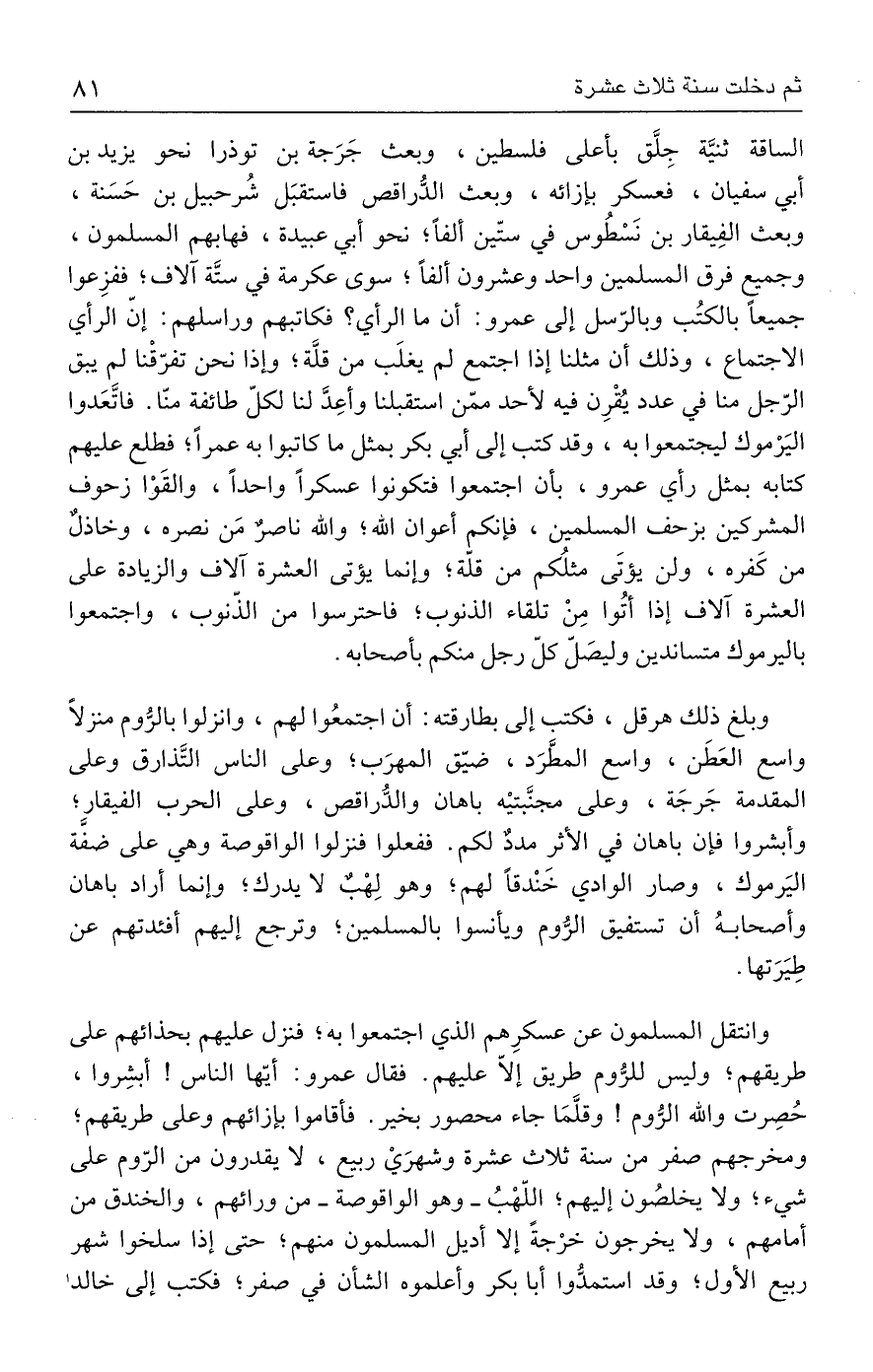 الساقة ثنيَّة جِلَّق بأعلى فلسطين، وبعث جَرَجة بن توذرا نحو يزيد بن أبي سفيان، فعسكر بإزائه، وبعث الدُّراقص فاستقبَل شُرحبيل بن حَسَنة، وبعث الفِيقار بن نَسْطُوس في ستّين ألفًا؛ نحو أبي عبيدة، فهابهم المسلمون، وجميع فرق المسلمين واحد وعشرون ألفًا؛ سوى عكرمة في ستَّة آلاف؛ ففزِعوا جميعًا بالكتُب وبالرّسل إلى عمرو: أن ما الرأي؟ فكاتبهم وراسلهم: إنّ الرأي الاجتماع، وذلك أن مثلنا إذا اجتمع لم يغلَب من قلَّة؛ وإذا نحن تفرّقْنا لم يبق الرّجل منا في عدد يُقْرِن فيه لأحد ممّن استقبلنا وأعِذَ لنا لكل طائفة منّا. فاتَّعَدوا اليَرْموك ليجتمعوا به، وقد كتب إلى أبي بكر بمثل ما كاتبوا به عمرًا؛ فطلع عليهم كتابه بمثل رأي عمرو، بأن اجتمعوا فتكونوا عسكرًا واحدًا، والقَوْا زحوف المشركين بزحف المسلمين، فإنكم أعوان الله؛ والله ناصرٌ مَن نصره، وخاذلٌ من كَفره، ولن يؤتَى مثلُكم من قلة؛ وإنما يؤتى العشرة آلاف والزيادة على العشرة آلاف إذا أتُوا مِنْ تلقاء الذنوب؛ فاحترسوا من الذّنوب، واجتمعوا باليرموك متساندين وليصَلّ كلّ رجل منكم بأصحابه.