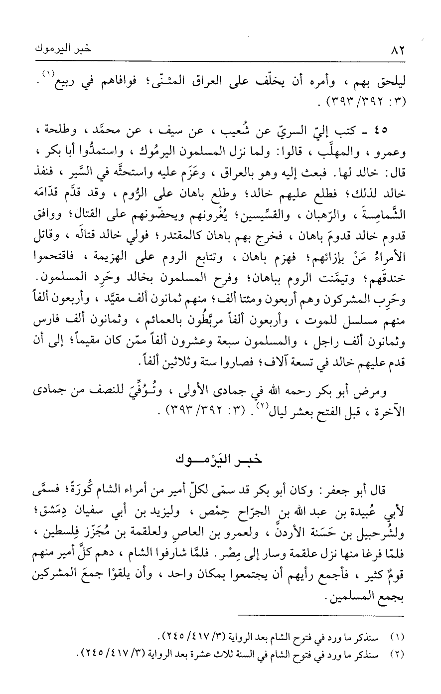 ٤٥ - كتب إليّ السريّ عن شُعيب، عن سيف، عن محمَّد، وطلحة، وعمرو، والمهلَّب، قالوا: ولما نزل المسلمون اليرمُوك، واستمدُّوا أبا بكر، قال: خالد لها. فبعث إليه وهو بالعراق، وعَزَم عليه واستحثَّه في السَّير، فنفذ خالد لذلك؛ فطلع عليهم خالد؛ وطلع باهان على الرُّوم، وقد قدَّم قدّامَه الشَّمامِسةَ، والرّهبان، والقسِّيسين؛ يُغْرونهم ويحضّونهم على القتال؛ ووافق قدوم خالد قدومَ باهان، فخرج بهم باهان كالمقتدر؛ فولي خالد قتاله، وقاتل الأمراءُ مَنْ بإزائهم؛ فهزم باهان، وتتابع الروم على الهزيمة، فاقتحموا خندقَهم؛ وتيمَّنت الروم بباهان؛ وفرح المسلمون بخالد وحَرِد المسلمون. وحَرِب المشركون وهم أربعون ومئتا ألف؛ منهم ثمانون ألف مقيَّد، وأربعون ألفًا منهم مسلسل للموت، وأربعون ألفًا مربَّطُون بالعمائم، وثمانون ألف فارس وثمانون ألف راجل، والمسلمون سبعة وعشرون ألفًا ممّن كان مقيمًا؛ إلى أن قدم عليهم خالد في تسعة آلاف؛ فصاروا ستة وثلاثين ألفًا.
