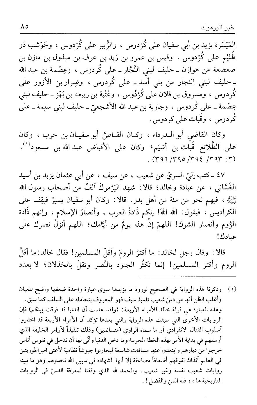 ٤٧ - كتب إليّ السريّ عن شعيب، عن سيف، عن أبي عثمان يزيد بن أسيد الغَسَّاني، عن عبادة وخالد؛ قالا: شهد اليَرْموكَ ألفٌ من أصحاب رسول الله - صلى الله عليه وسلم -، فيهم نحو من مئة من أهل بدر. قالا: وكان أبو سفيان يسيرُ فيقِف على الكراديس، فيقول: الله اللهَ! إنكم ذَادةُ العرب، وأنصارُ الإسلام، وإنهم ذَادة الرُّوم وأنصار الشرك! اللهمّ إنّ هذا يومٌ من أيَّامك؛ اللهم أنزلْ نصرك على عبادك!