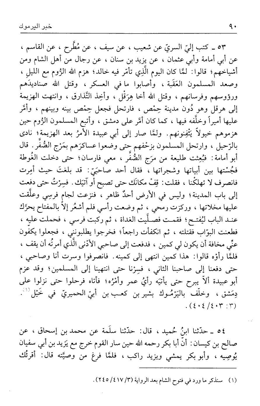 ٥٣ - كتب إليّ السريّ عن شعيب، عن سيف، عن مُطَّرح، عن القاسم، عن أبي أمامة وأبي عثمان، عن يزيد بن سنان، عن رجال من أهل الشام ومن أشياخهم؛ قالوا: لمَّا كان اليوم الَّذِي تأمّر فيه خالد؛ هزم الله الرُّوم مع الليلِ، وصعد المسلمون العَقَبة، وأصابوا ما في العسكر، وقتل الله صناديدَهم ورؤوسهم وفرسانهم، وقتل الله أخا هِرَقْل، وأخِذ التَّذارق، وانتهت الهزيمة إلى هرقل وهو دُون مدينة حِمْص، فارتحل فجعل حِمْص بينه وبينهم، وأمَّر عليها أميرًا وخلَّفه فيها، كما كان أمَّر على دمشق، وأتبع المسلمون الرُّوم حين هزموهم خيولًا يَثْفِنونهم. ولمَّا صار إلى أبي عبيدة الأمرُ بعد الهزيمة؛ نادى بالرّحيل، وارتحل المسلمون بزحْفهم حتى وضعوا عساكرَهم بمَرْج الصُّفَّر. قال أبو أمامة: فبُعِثت طليعة من مرَج الصُّفَّر، معي فارسان؛ حتى دخلت الغُوطة فجُسْتها بين أبياتها وشجراتها، فقال أحد صاحبَيّ: قد بلغتَ حيث أمِرت فانصرف لا تهلكْنا، فقلت: قِفْ مكانَك حتى تصبح أو آتيَك. فسِرْتُ حتى دفعت إلى باب المدينة؛ وليس في الأرض أحدٌ ظاهر، فنزعت لجام فرسِي وعلَّقت عليها مخلاتها، وركزت رمحي، ثم وضعت رأسي فلم أشعُر إلّا بالمفتاح يحرَّك عند الباب ليُفتح؛ فقصت فصلَّيت الغداة، ثم ركبت فرسي، فحملت عليه، فطعنت البوّاب فقتلته، ثم انكفأت راجعًا؛ فخرجوا يطلبونني، فجعلوا يكفّون عنِّي مخافة أن يكون لي كمين، فدفعت إلى صاحبي الأدْنى الَّذي أمرتُه أن يقف، فلمَّا رأوْه قالوا: هذا كمين انتهى إلى كمينه. فانصرفوا وسرت أنا وصاحبي، حتى دفعنا إلى صاحبنا الثاني، فسِرْنا حتى انتهينا إلى المسلمين؛ وقد عزم أبو عبيدة ألّا يبرح حتى يأتيَه رأيُ عمر وأمْرُه؛ فأتاه فرحلوا حتى نزلوا على دِمَشق، وخلّف باليَرْمُوك بشير بن كعب بن أبيّ الحميريّ في خَيْل (١). (٣: ٤٠٣/ ٤٠٤).